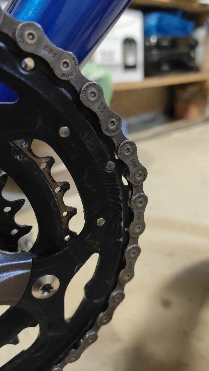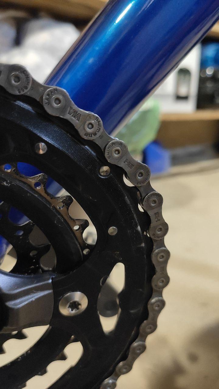 Вчера делал ТО велосипеда, настраивал переключатели передач и заметил, что цепь на передней звездочке немного прыгает. Начал смотреть детально и заметил вот такое. В двух местах цепь не плотно прилегает к звезде. Что это может быть? Растянутая цепь?