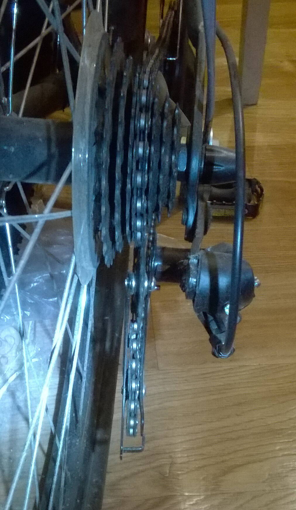 Пробег 150 км. Когда регулировал задний тормоз, обратил внимание, что рамка заднего переключателя перекошена относительно трещотки. Т.е. плоскости рамки и звёзд не параллельны.