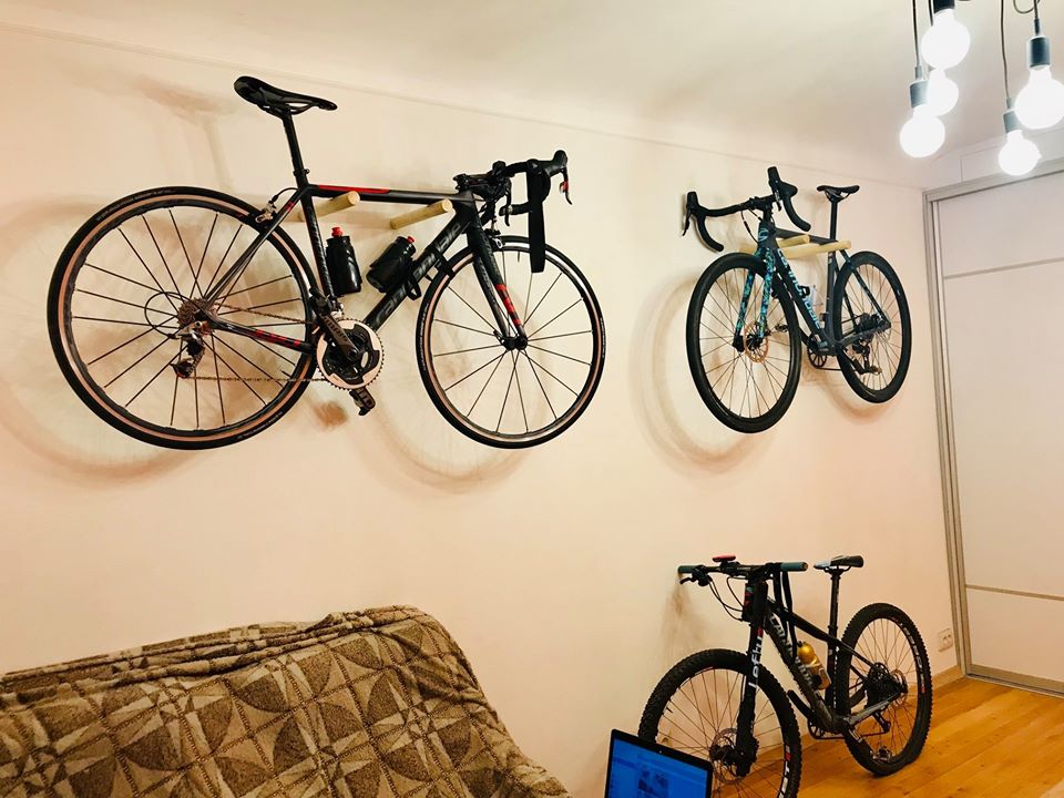 На амазоне видел подобные по 50 баксов вроде, по запросу что-то типа bike wood wall mount, но я сам делал, две шуруп шпильки, два анкерных болта и черенок толстый для садового инструмента, выходит копеечно, но надо потратить время.