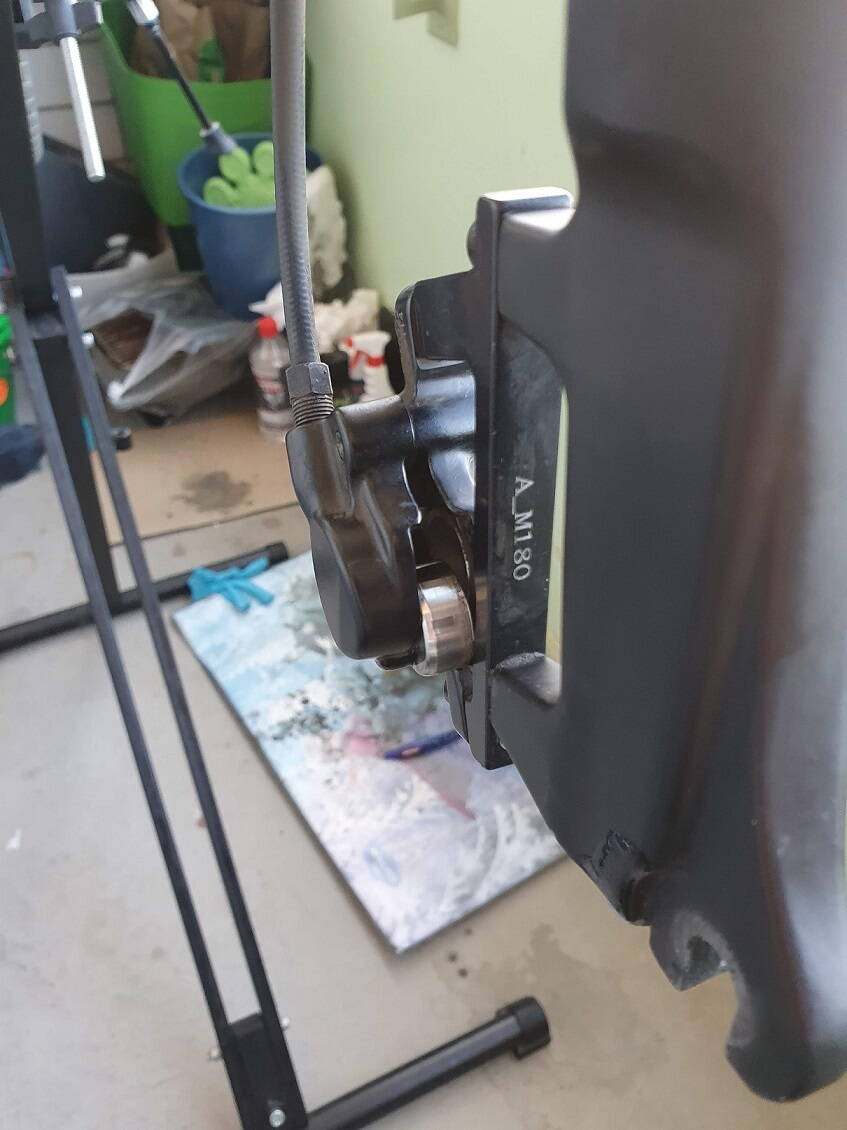 Снял колесо, несколько раз качнул ручкой тромоза, потекла жидкость и вывалился с одной строны поршень.
