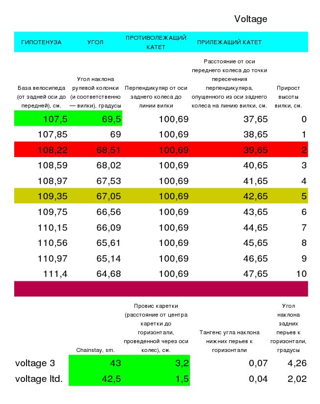 На моем велосипеде (размер рамы L) угол вилки 69,5 градусов, а на рамах таких же как у меня Вольтажей 3 но меньших размеров - 68,5 градусов, значит наверное из этого следует сделать вывод, что желательно мне не уменьшать угол вилки больше чем на 1 градус. Это даёт 2 см. на длине вилки, что с моими исходными данными даёт максимальный ход новой вилки 95...100 мм.