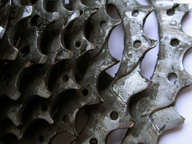 Мне не нравится как изнашивается моя SRAM PG-850, собственно почему зубья не стираются, а расплескиваются в стороны, что неблаготворно сказывается на переключении. На фото кассете 4к, интересно как ведут себя кассететы по 300грн и дороже, если кому не в падлу, выложите фото и пробег.