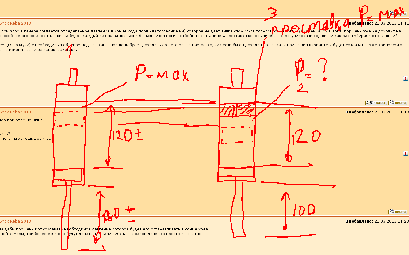 Ну вот гляди... ход поршня согласно ходу штока 120 мм, при этом в камере создается определенное давление в конце хода поршня (последние мм) которое не дает вилке сложиться полностью... если мы убираем 20 мм штока, поршень уже не доходит на 20мм до своей мертвой точки т.е. не создает давление способное его остановить и вилка будет каждый раз складываться и биться низом ноги в отбойник в штанине... проставки которыми обычно регулировали ход вилки как раз и убирали этот лишний объем сохраняя полностью характеристики вилки.