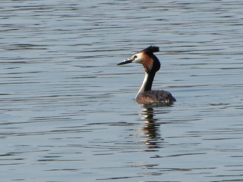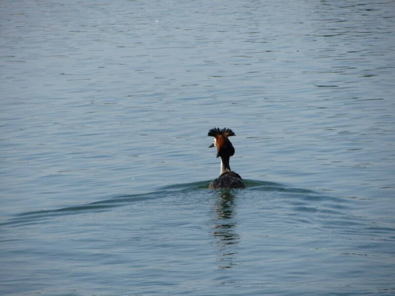 Это чомга или большая поганка. Любит водоемы с достаточным пространством открытой воды. У нас в области из поганок - самая благополучная и многочисленная. Гнездится на всех водохранилищах и крупных прудах, на озерах, иногда и в речных заливах на больших реках. Питается рыбой. У нее еще очень красивые брачные демонстрации, которые можно наблюдать весной.