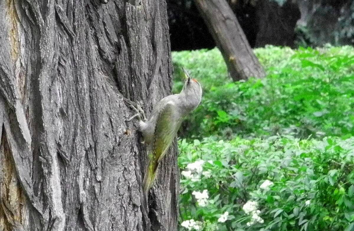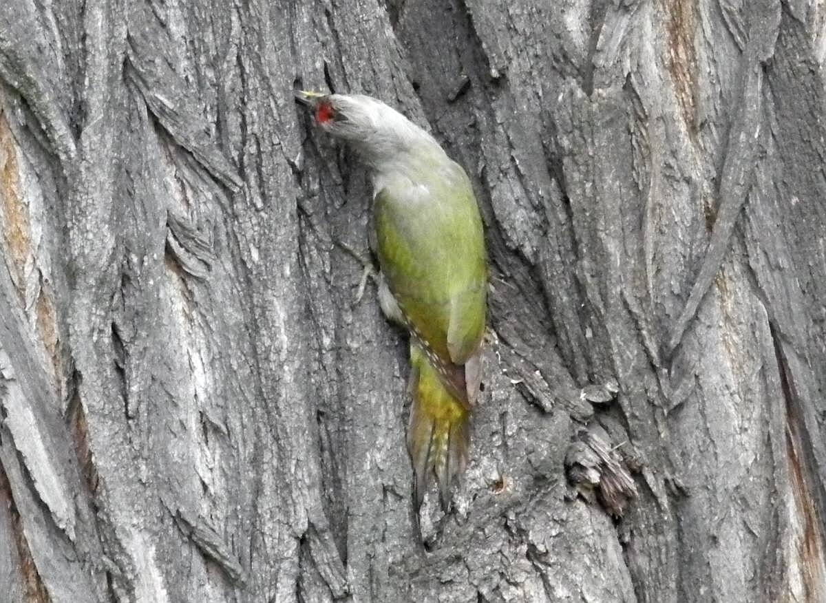 Дятел этот не зеленый, а седой. На Украине два похожих вида, но в Восточной и Центральной водится только седой. У него характерный серый цвет на голове и шее. На фотографии - взрослый самец.