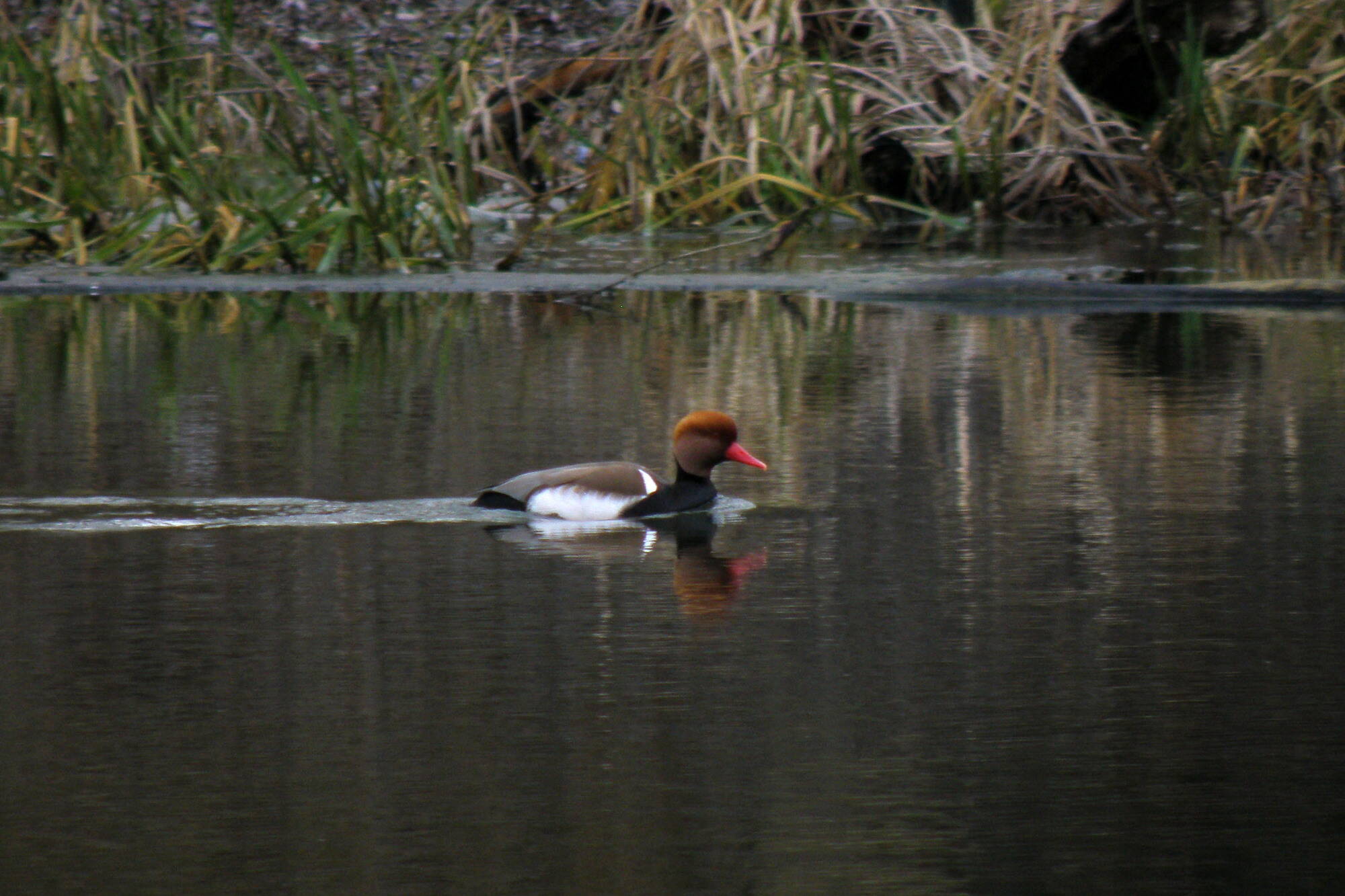 Это всё летом. А в прошлое воскресенье встретили на Лопани выше Алексеевского гидропарка красноносого нырка (6). Редкий вид, особенно для наших мест, т.к. зона его распространения - Приазовье, Причерноморье. Плавал в компании с кряквами.
