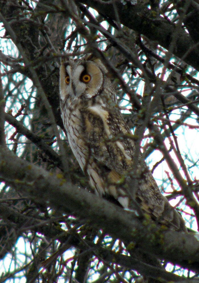 К разговору о совах - сова ушастая. Сфотографировал год назад на даче. Причём я вначале спугнул её, было метра 2 между нами. А потом ходил за ней, фотографировал. Удивил очень плавный и безшумный полёт, ну и повороты шеи на 360 градусов. Из литературы вычитал, что у совы для лучшего зрения глаза неподвижны (если словами фотографа - светосильная и фиксированная оптика), а поворотом головы достигается обзорность.