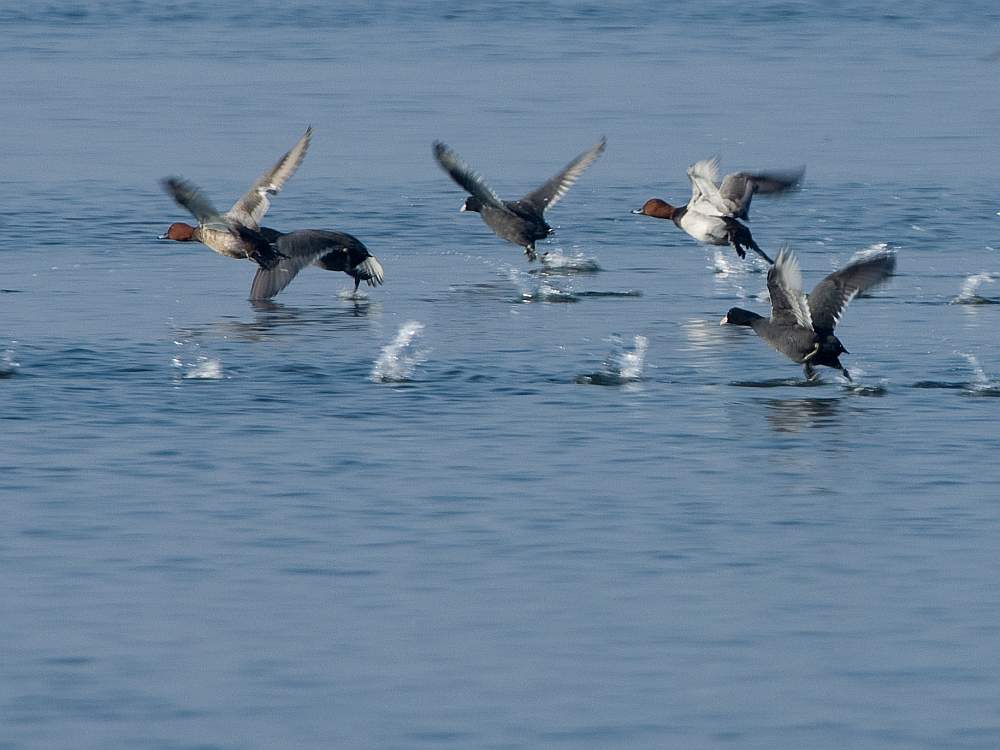 Потребовалось поднять лысух на крыло, чтобы разглядеть, что кроме водяных куриц, на мелководье залива пасутся и очень симпатичные красноголовые утки-чернеть: