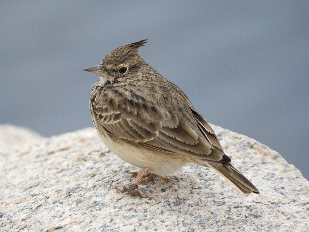 Не чайка - хохлатый жаворонок на прибрежном камешке. Что с левой лапой?.. Непонятно. Результат неудачного знакомства с той же чайкой, вороной или котом? А по правде - так удачного, так как всего-то не съели, а пальцев - вон еще как много осталось...