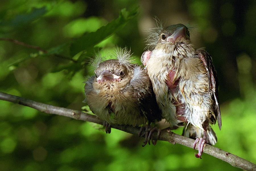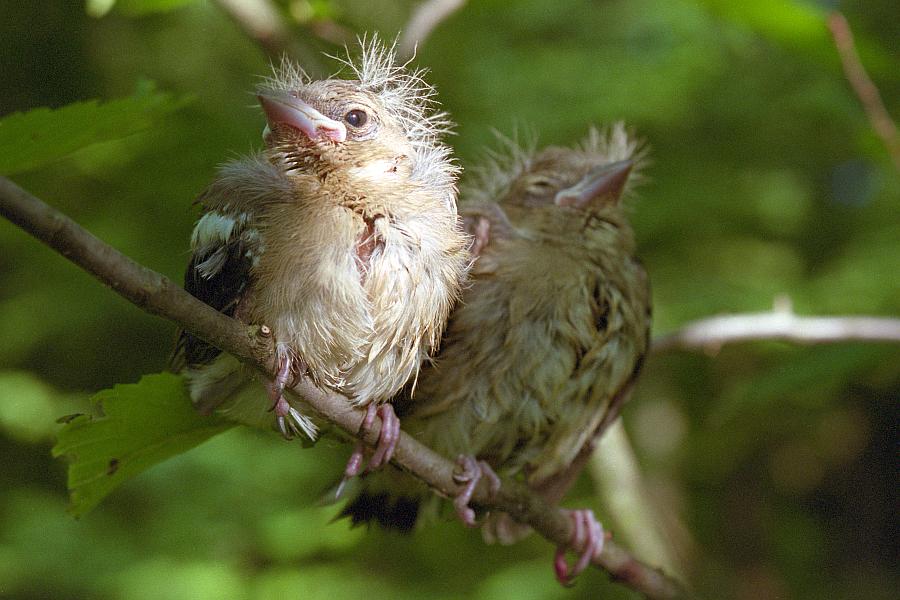 Шел я как-то летом по лесной тропинке вдоль Донца, и вдруг слышу наверху, в листве, какой-то шум. Поднимаю голову - и тут буквально мне зашиворот сыплются птенцы! Один улетел в лес, двое сумели выровнять полет и направились на другую сторону Донца, а вот этим двоим - силенок, видно, не хватило, и шлепнулись они в воду недалеко от берега, ну и по обыкновению птичьему тут же принялись тонуть. Пришлось мне, как говорится, "скидовать штаны" и становиться ОСВОД-овцем, спасая невинные пернатые души :) В знак благодарности слетки немного попозировали.