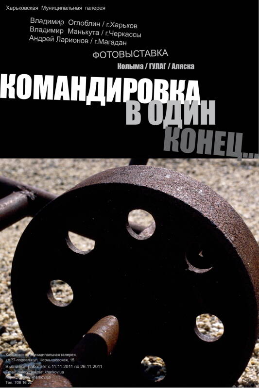 Фотовыставка " Командировка в один конец..." посвящена трагической истории нашего народа в период сталинских репрессий 30х40-х гг. ХХст. Фтотографии были сделаны в 1995 и 20010 г. 3-я авторами : Владимиром Оглоблиным ( г.Харьков), Андреем Ларионовым ( г. Магадан), Владимиром Манькутой ( г. Черкассы). Владимир Оглоблин представил фото вольфрамого рудника "Аляскитовый", который известен как "Аляска". Это одно из самых страшных мест колымского Дальстроя, куда "командировали" здоровых, работоспособных заключенных, задачей которых было добывать вольфрамовую руду 3 - 4 месяца, а потом - умирать... Подходил следующий этап на 3 - 4 месяца и снова... умирать.