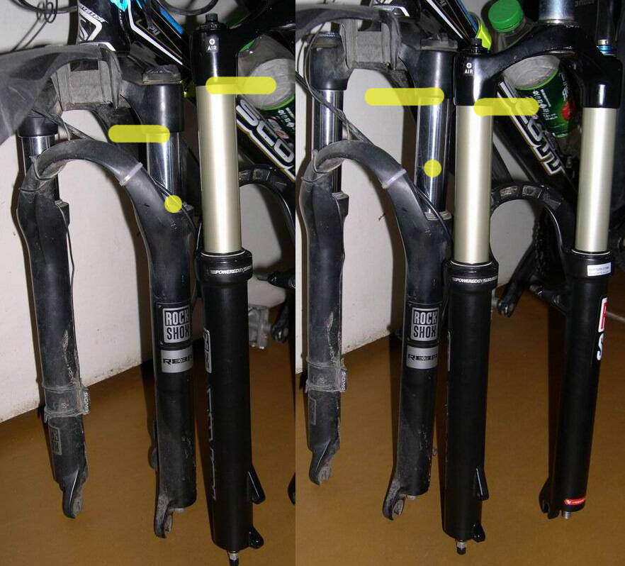 Что показываю на фото - прелесть U-Turn-а в наглядном виде. На одном кадре минимум хода, на другом - максимум. Для сравнения рядом поставил Ребу 29' под ход 80мм. Там только на "начинке" Ребы 29 на ход 80мм сидят "короткие штаники" от Торы 26.... так что