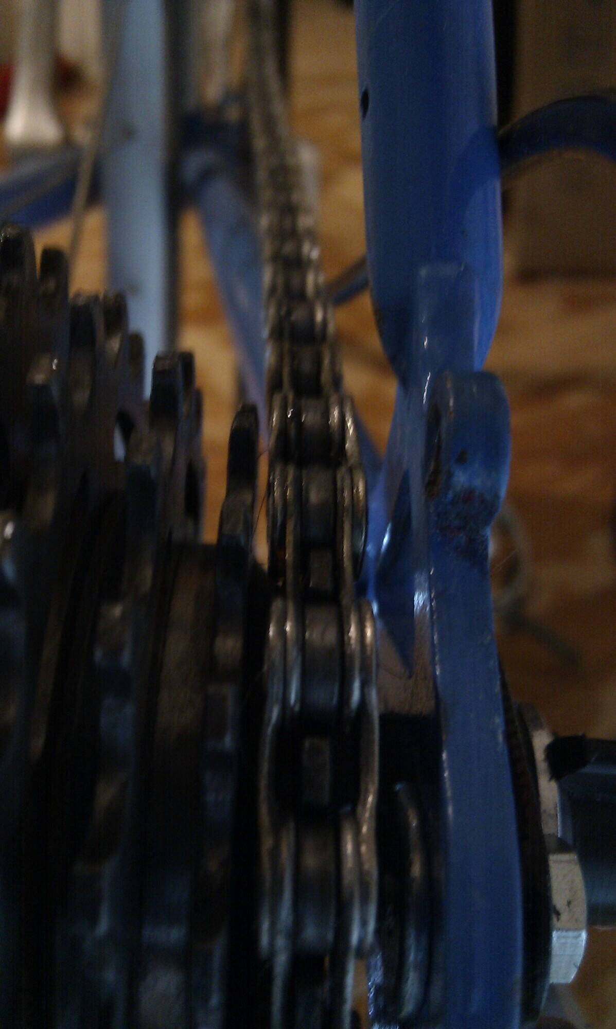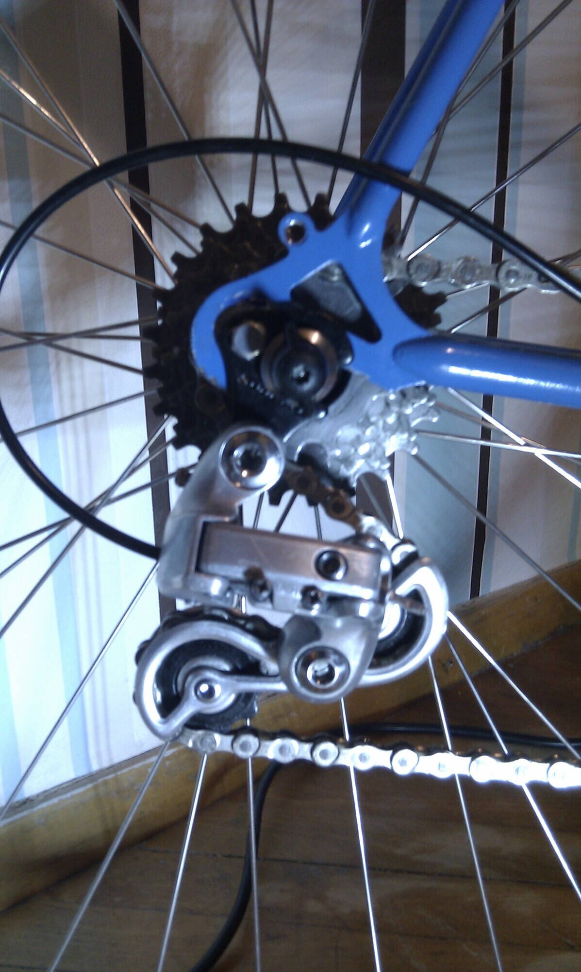 Кассета цеплялась за перо при установке колеса. Зазор между малой звездой трещотки и нижним правым пером при установленом колесе был около 2 мм. Для того, чтобы увеличить зазор повторно перебрал колесо и перетасовал шайбы. Обод сместился от центра, но не критично, так что зонт повторно не ровнял. Выиграл аж 1,5 мм.