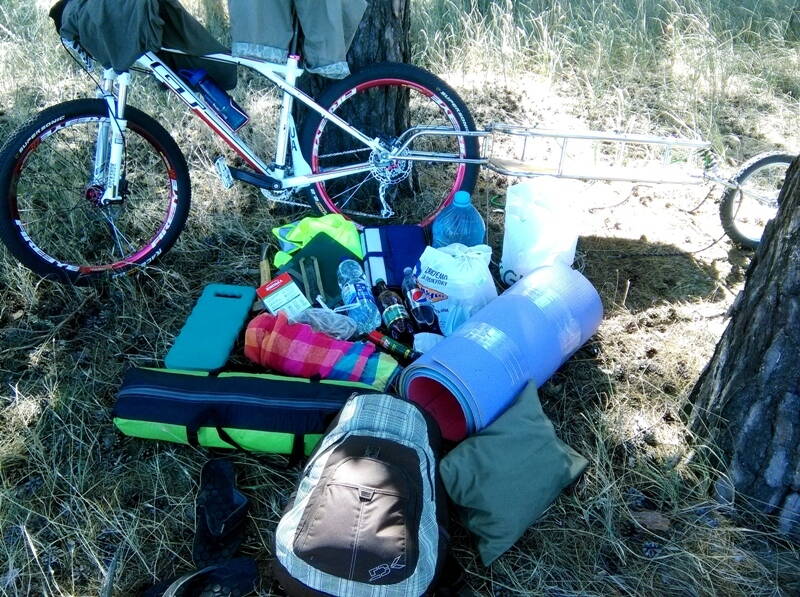 Единственный недостаток прицепа - трудности передвижения по песку, где вел нужно вести. Если такие участки в походе практически отсутствуют - прицепчик ведет себя очень даже хорошо. Еще одно замечание, вскрывшееся в процессе эксплуатации - гайки на посадочных винтах нужно садить на фиксатор резьбы, а бабочки сверху контрить гаечками. Фото из последнего похода - прицеп и что в него влезло. Трехместная палатка, 2 каремата, гамак, рюкзак с вещами, 10 литров воды, литр пепси, литр пива, литр йогурта, кулек с продуктами, топорик, чайник, пилка раскладная, 2 нажопника, насос полноразмерный, веревки для гамака, зарядка на солнечных батареях, спрей от комаров, шлепанцы(вьетнамки), пляжная подстилка-сумка (так же использовалась как подложка под карематы для лучшей тепло и влаго изоляции.
