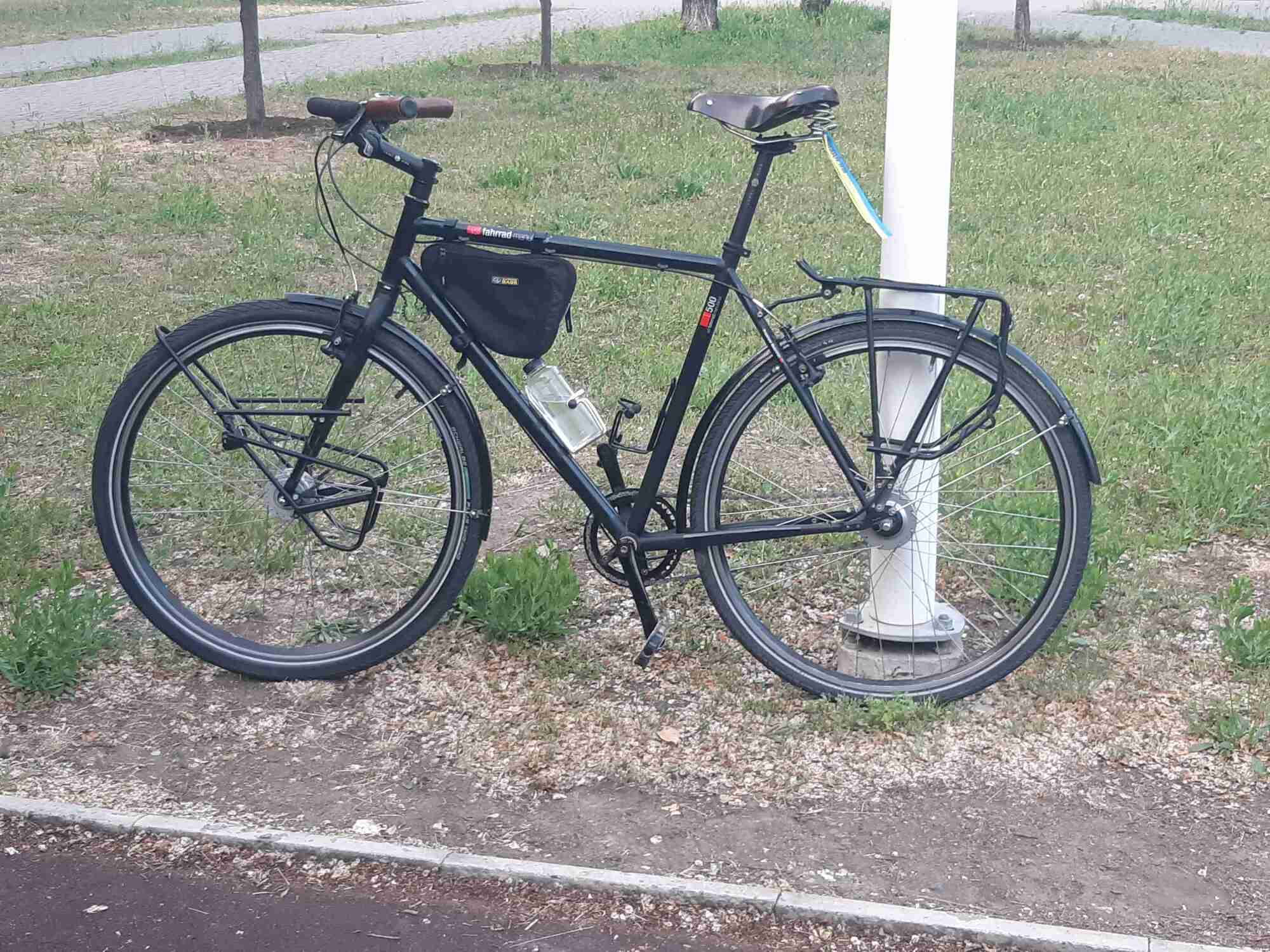 В виде как на фото: рама хромоль, 2 багажника, планетарка 8-ск, самодельный стальной руль, 2 флягодержателя, тяжелое седло на пружинах, покрышки с хорошей защитой и антипроколом в камерах...