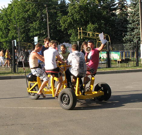 И по сути:На этом велосипеде у всех семерых седоков есть возможность крутить педали, но только один может управлять таким транспортом, оборудованным автомобильным рулем и тормозами.