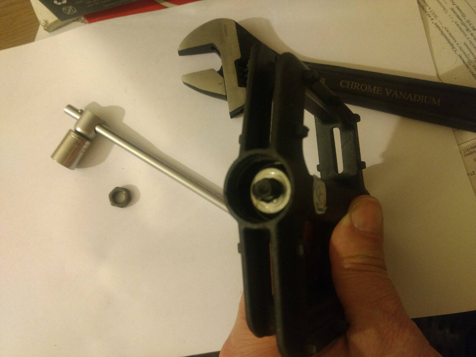 Нет, я пока не дошел до леруа мерлен, завтра доберусь. Там можно купить либо вороток большой 1\2 и к нему головку на 12, либо вот такой набор ключей торцовых дешевых, среди них есть на 12. Потом идея такая: раз у меня нет тисков, закручу обратно педаль на шатун, захвачу с той стороны ключём рожковым на 15, а со стороны гайки буду пробовать другой рукой срывать гайку в противоход. Главное рычаг чтоб большой был