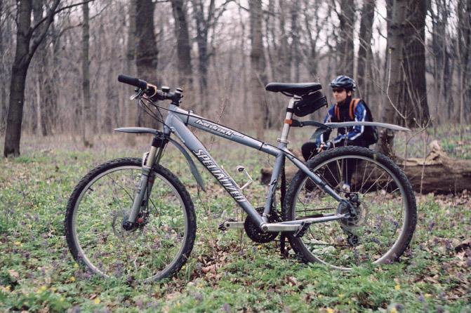 Практически сразу приделал самодельный рок-ринг (скорее для защиты ноги от звезды, чем звезды от препятствия) из гетинакса. К лету приобрел покрышки, т.к. родные для асфальта годились слабо. А именно Kenda Kobra 26x2.0 (ушастый полуслик),Michelin Country 26x1.95(направленные шипы) и Continental(слик с вдавленными Т, вроде). Поставил более агрессивные педали Wellgo Magnesium.В первое лето заменил вынос на более длинный и легкий и переднее колесо в сборе ( в магазине на Культуры), оно было не очень, но тогда я не дорос до сборки на заказ, и Deore-овская втулка действовала гипнотически. Ещё были куплены агрессивные крылья SKS и багажник для перевозки всего рыболовного снаряжения. Вот так велосипед выглядел в походном состоянии. Прошу прощения за качество.