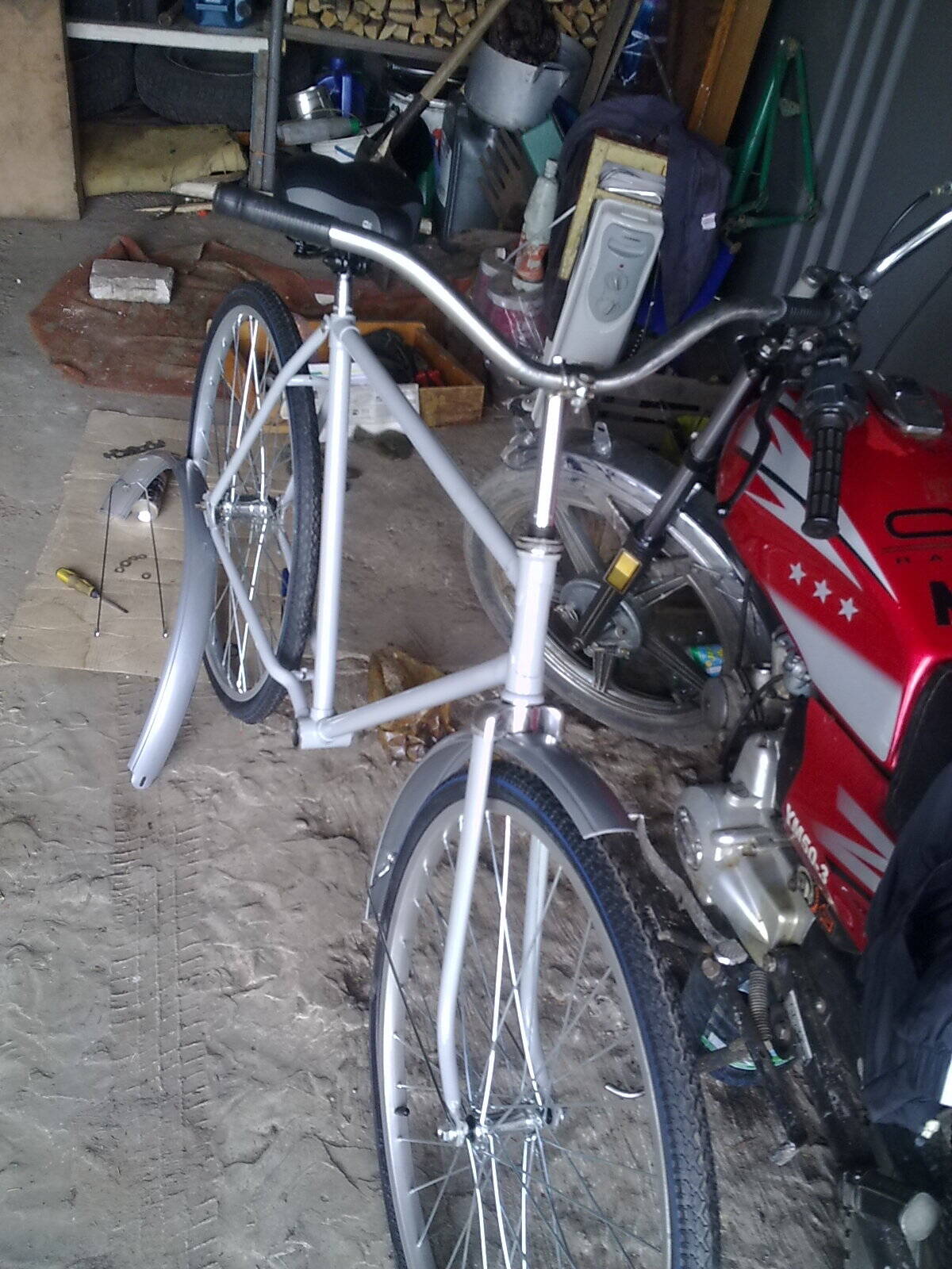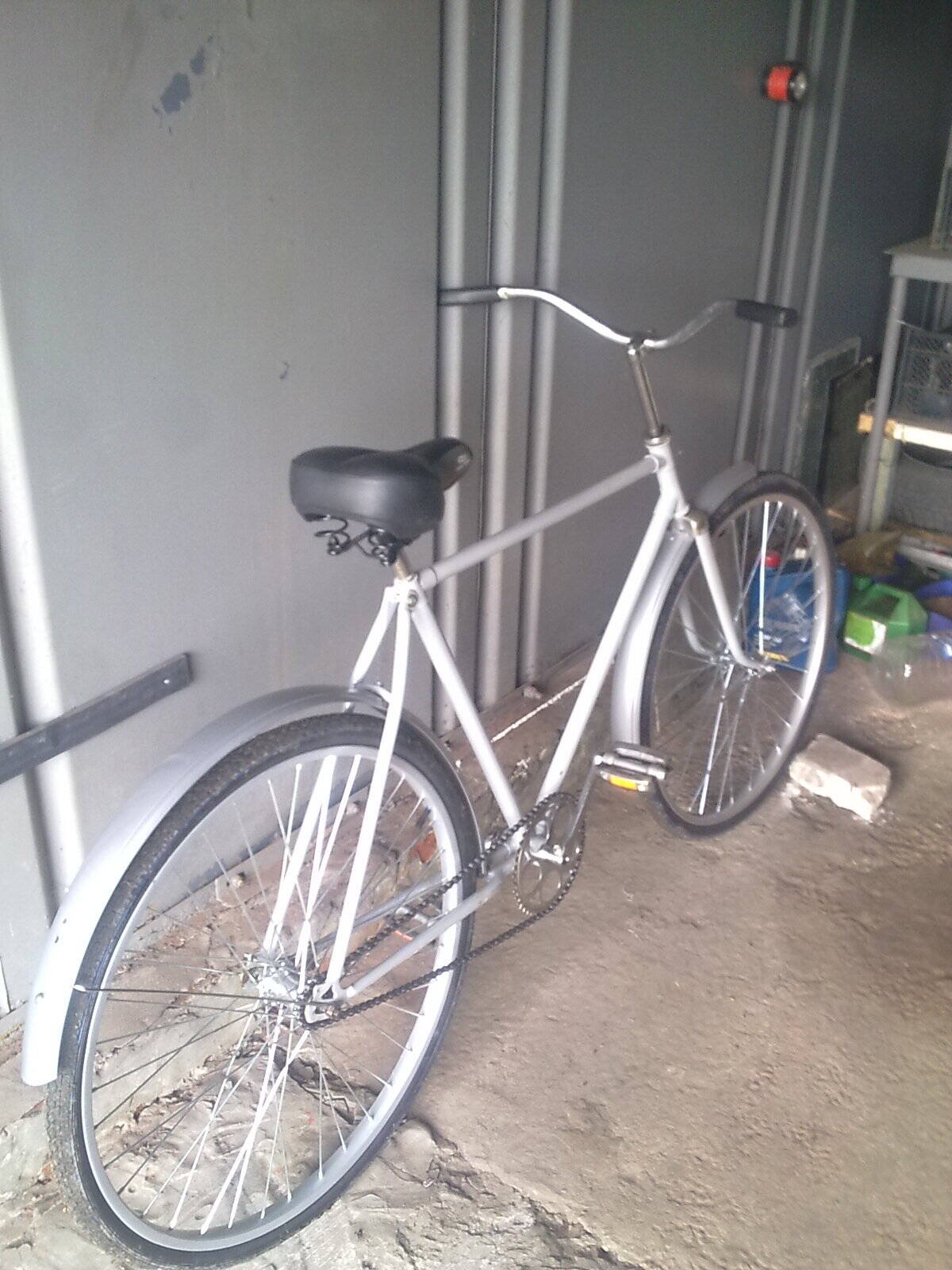 На жаль фото велосипеда в первісному стані немає, та і фотографувати було нічого - все іржаве, криве. Роботу почав з зачистки та фарбування вилки, рами(фарбував пензликом), потім відполірував руль, електроінструментом не користувався, все робив за допомогою наждачки, ось і вся реставрація, всі інші деталі нові, особливої уваги заслуговують педалі - на них крива різьба(на обох!) та повністю відсутня смазка(видно на фото), поки що немає багажника, і найголовніше - дзвіночка на руль.