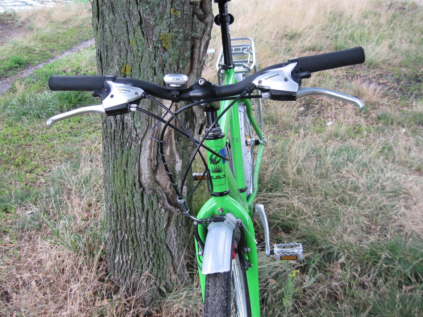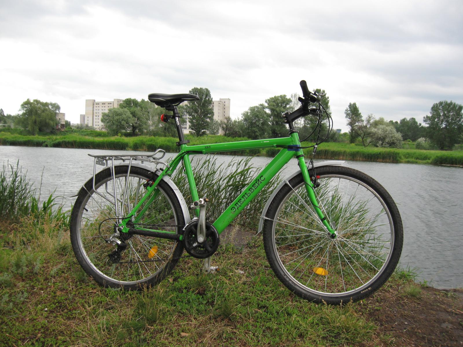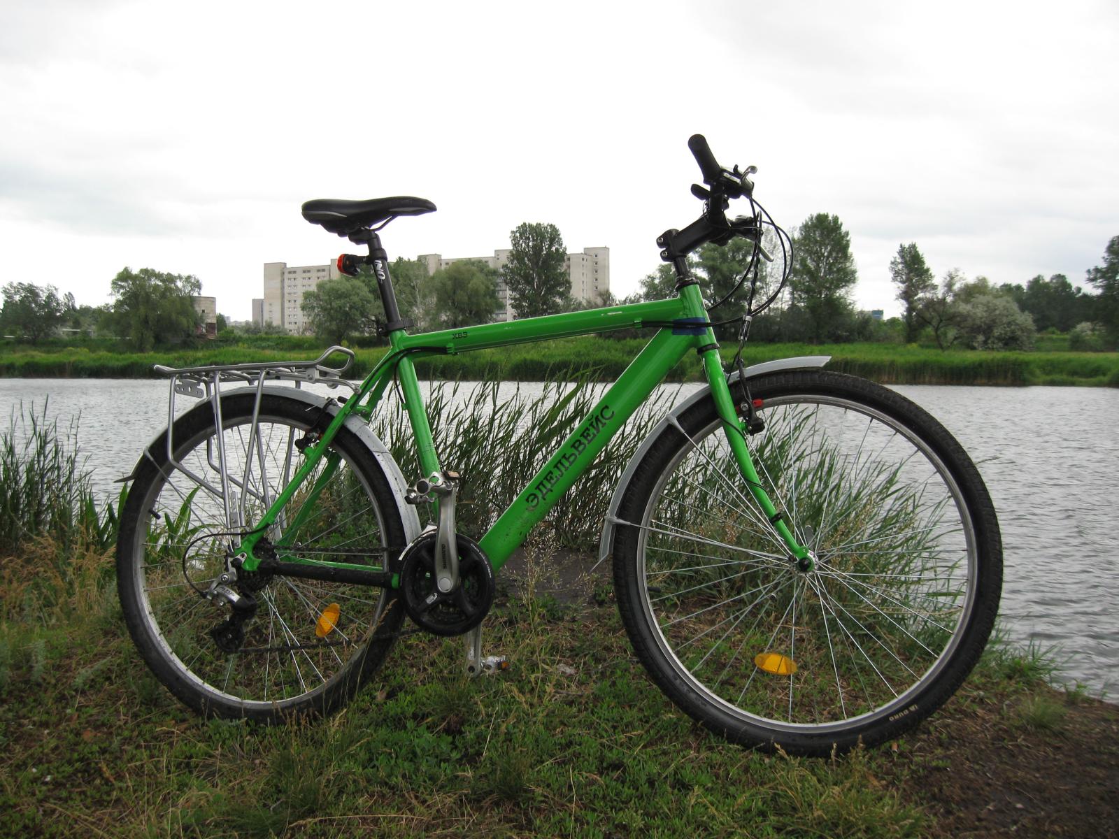 Купил я велик далекой осенью 2009-го в магазине ЮСИ. Назывался он "Эдельвейс", Харьковского Велосипедного Завода. Это был мой первый "горный" велосипед, после стального ригида-синглспида со втулкой "торпедо" :) Мне понравилось, что у него алюминиевая рама и обвес Shimano по кругу, а цена при этом была 1099 грн. А также он был красивеньким - орнажево-синим :) В итоге велосипед устраивал всем, за исключением паршивой разболтавшейся вилки и рулевого стакана дюймового стандарта (не поставишь нормальную вилку). Вообщем я решил его проапгрейдить: купил новую жесткую вилку вместо плохой амортизированной, перекрасил раму и вилку в зелененький цвет :) , поставил подседельный штырь подлиннее, поменял педали, поставил крылья и багажник, и сменил резину на дорожную Duro с протектором-елочкой.