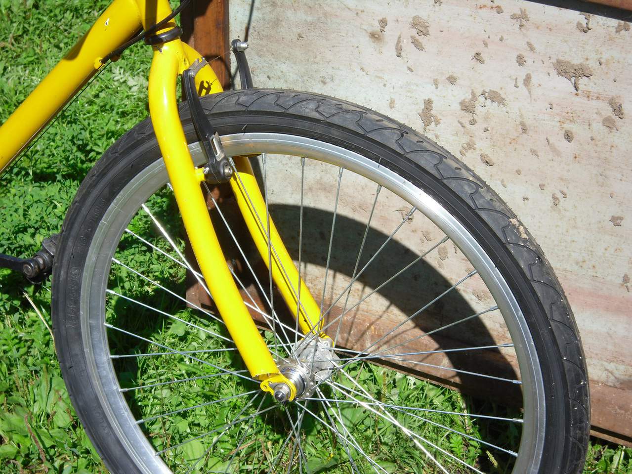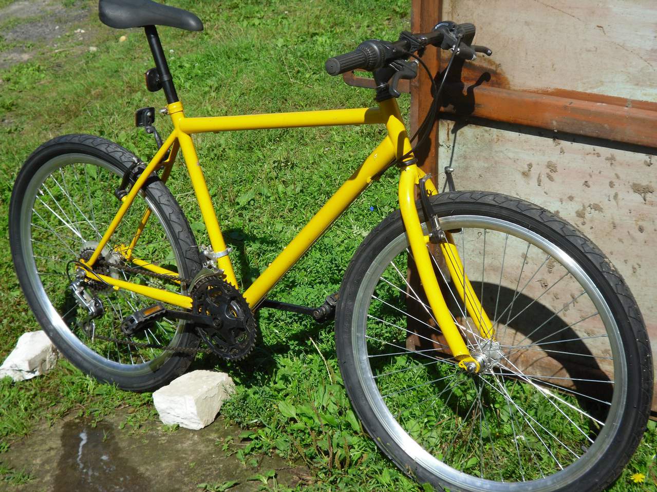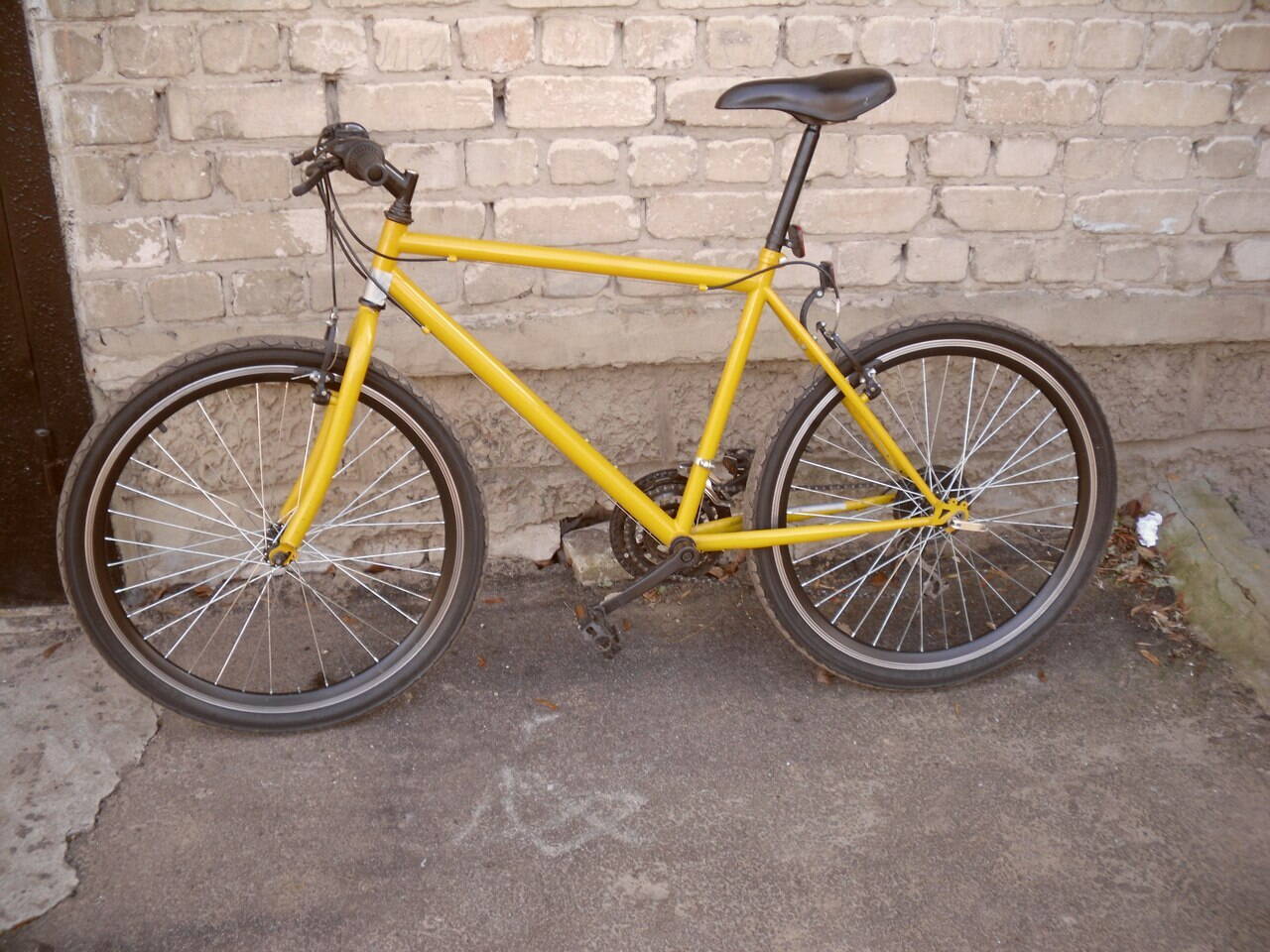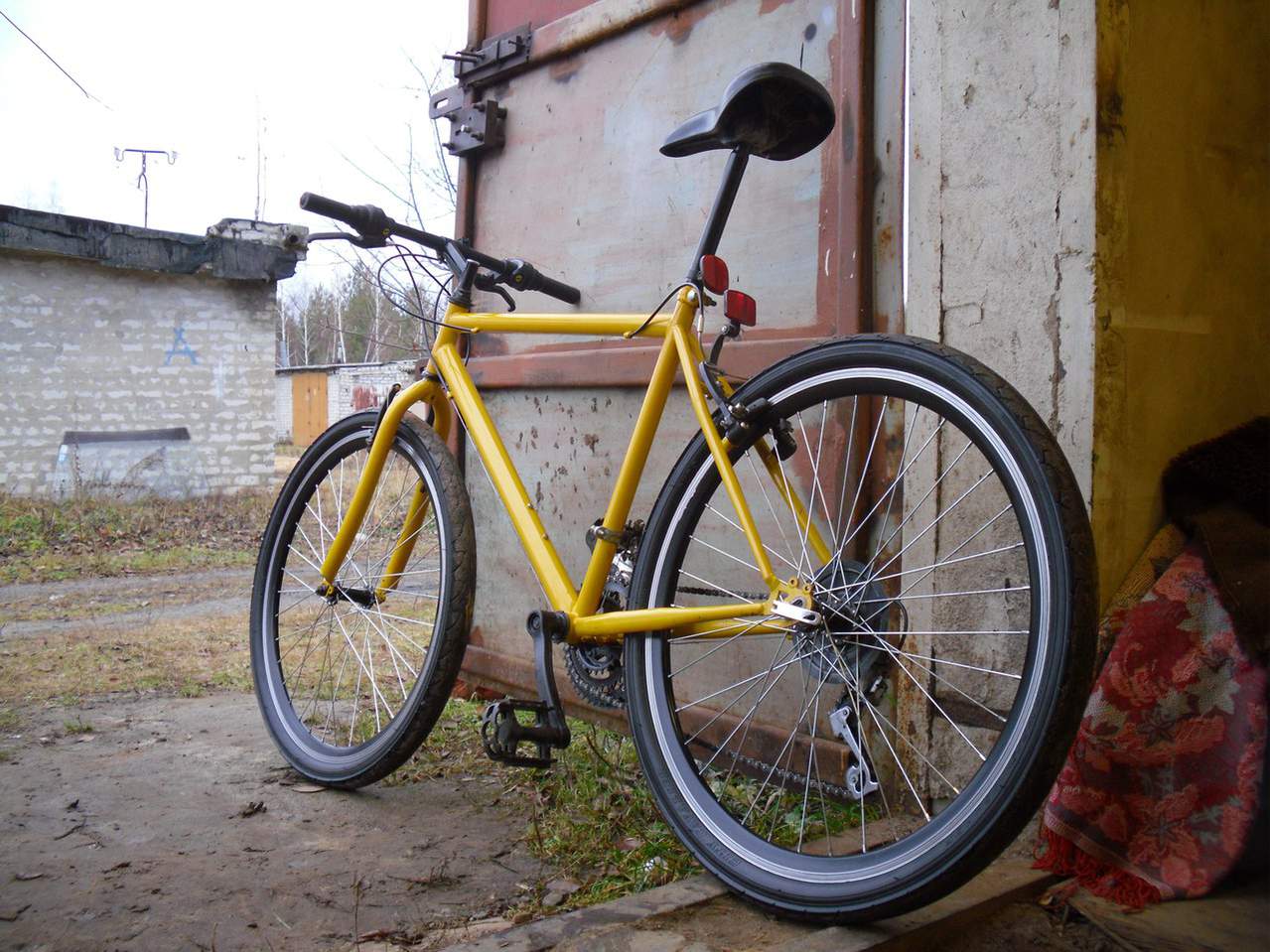 Далее начал поиск велосипеда.нашел у друга стальной ригид ноунейм.Фото до,каким был велосипед - к сожалению нет.Вот фото с первого этапа сборки и прмерки запчастей.запчасти естественно китай,других запчастей на тот момент,и к сожалению на нынешний - по сей день нет,в нашем городе нет ни каких магазинов.колеса хотел поставить со старого велика,но все же купил новые,черные,что бы выдержать черно-желтый стиль))ну и слики взял,фирмы DURO , о как делал все в стиле минимализма