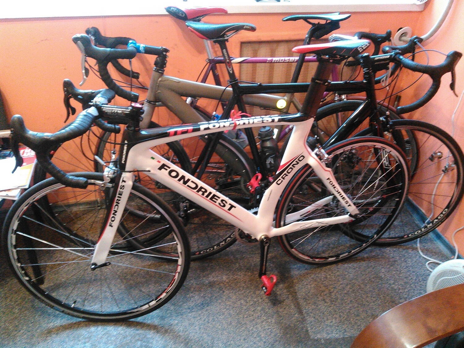И вот в конце прошлой недели пазл сложился ... FONDRIEST CRONO TF-1 был собран ! Самое смешное :D большинство людей пытаются сделать из шоссейника разделочный велосипед ... и многие в этом значительно преуспели / о чем свидетельствует огромное количество статей и видио в НЕТЕ /. Многи скажут ... а смысл такого конструирования / велосипед получился достаточно тяжелым ... если например сравнивать с моим магниевым ЛАЙТЕКОМ /. Все ОТВЕТЫ я получу вскоре как проведу тестирование . Завтра поеду его испытывать . Выкладываю его фото в стае моих шоссейных велосипедов и одного гравела , зимующих в офисе на работе .