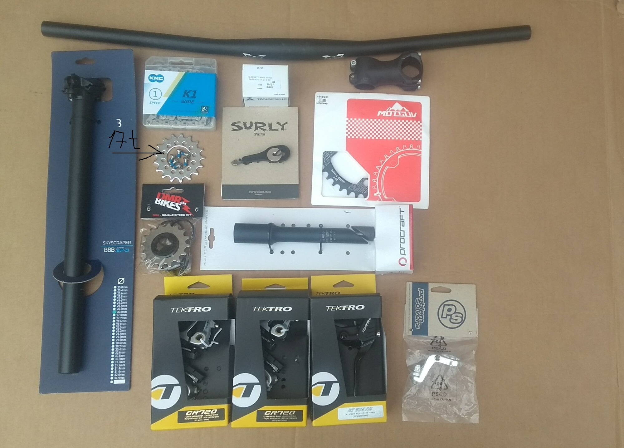 Все нужные Запчасти для сборки fixed gear/ singlspeed, нашел даже рулевую tange 1 стандарта JIS для вилок crown race 27,0mm, но самое сложное было раскопать трековую звездочку с креплением на 6 болтов к дисковому тормозу