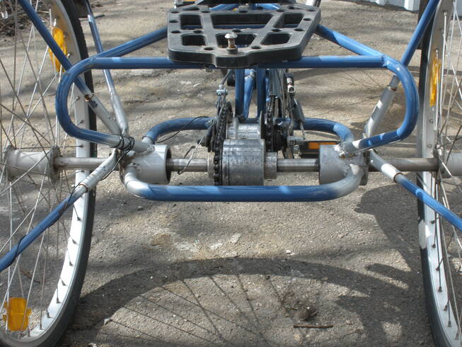 Итак, сам вел трехколесный, с 3х скоростной планетаркой Sachs с тормозом, передний барабанный тормоз, стояночный тормоз, задний мост с дифференциалом.