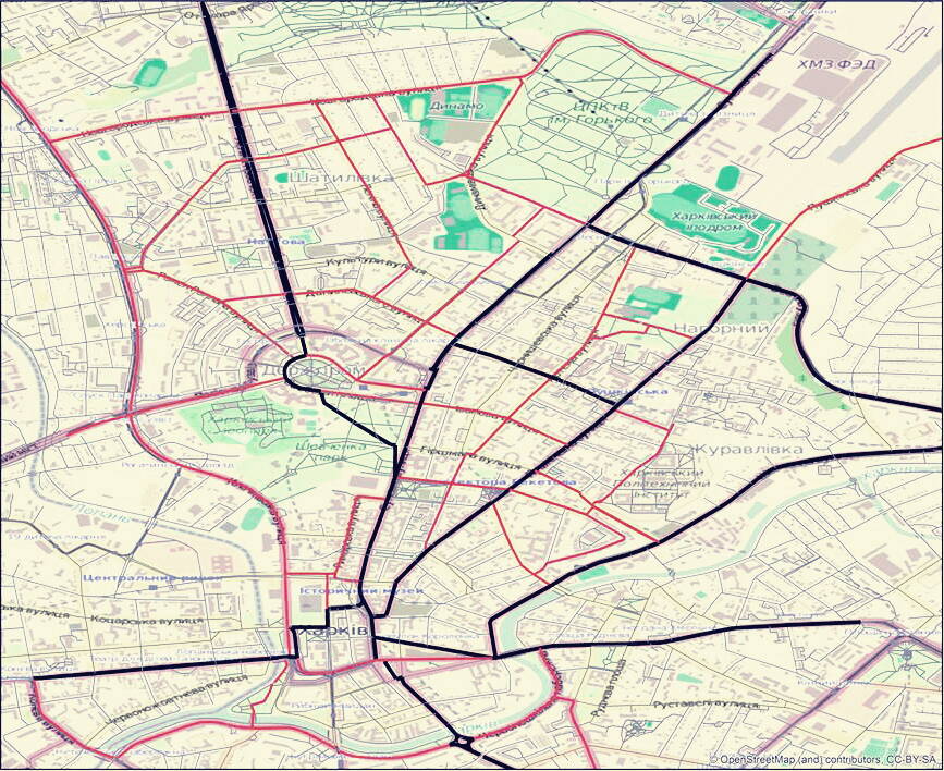 получившаяся карта. черные - основные дорожки - красные - второстепенные.