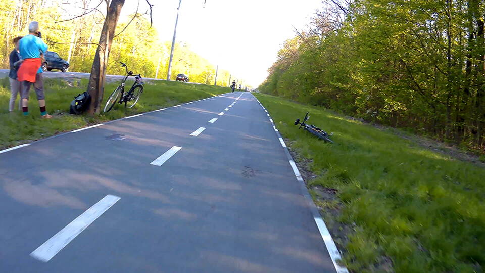 Катим вдвоём со стороны Пятихаток и я наблюдаю впереди странно стоящего чувака в траве с велосипедом на газоне. При том что он возле перекрёстка с автомобильной дорогой.