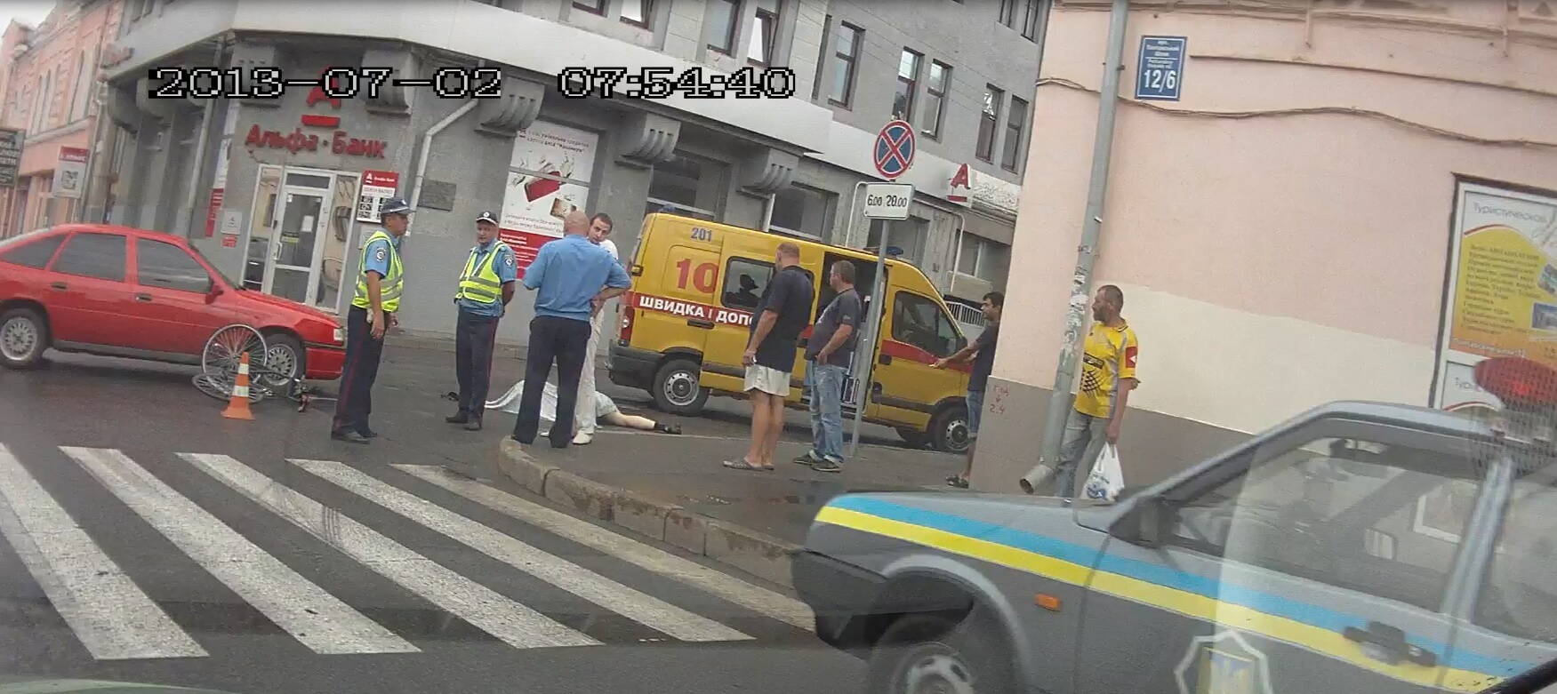 не понятно куда он вьехал и почему лежит на другой улице, на машине нет следов удара совсем
