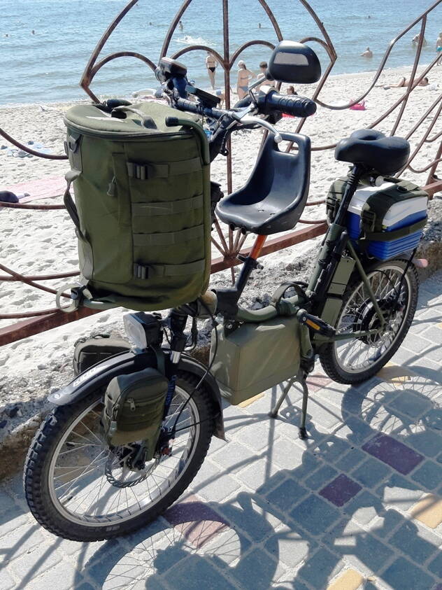 Каремат обычно на руль цепляется, он легкий и по ширине совпадает. Нарукавники и плавки можно сразу одеть. Еду в сумку холодильник, на багажник.