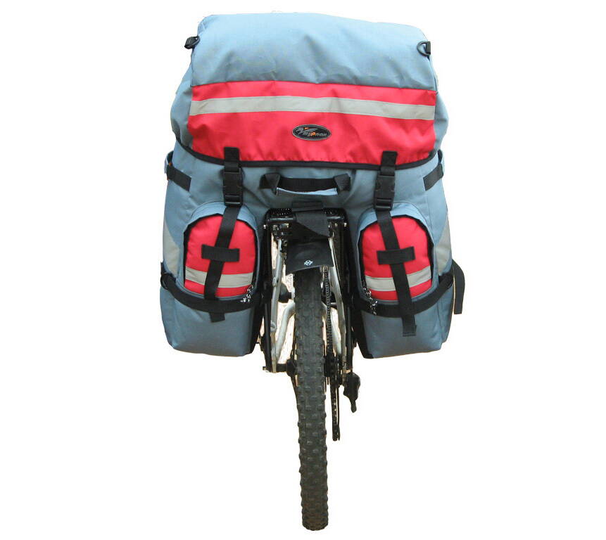 Я обычно закрепляю на багажнике палатку, спальник и велосипедный чехол (всего 4 - 4,5 кг.), остальное, кроме бутылки с водой (1,25 литра), везу в рюкзаке. К сожалению, спина - моё слабое место, поэтому приходится задумываться об альтернативах...