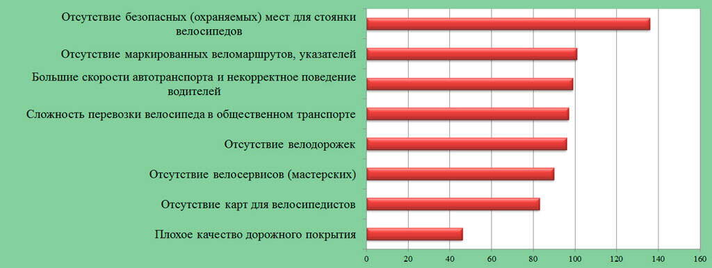 Почти половина участников анкетирования указали проблемой отсутствие безопасных (охраняемых) мест для стоянки велосипедов. Это оказалась самая «неудобная» проблема. Из комментариев к анкете: