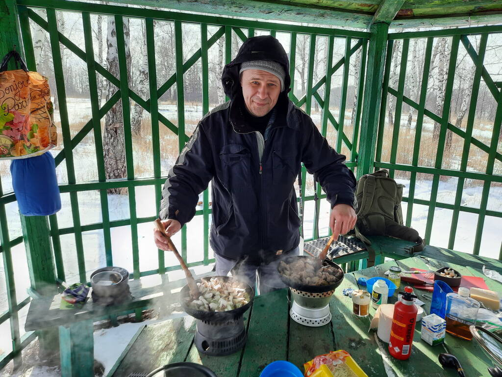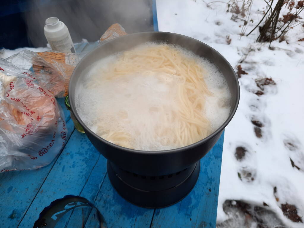 Зима этого года. Не -15, но снег лежал. И было меньше -5. Кухня и горелка Esbit. Эта модель мне нравится больше всего.