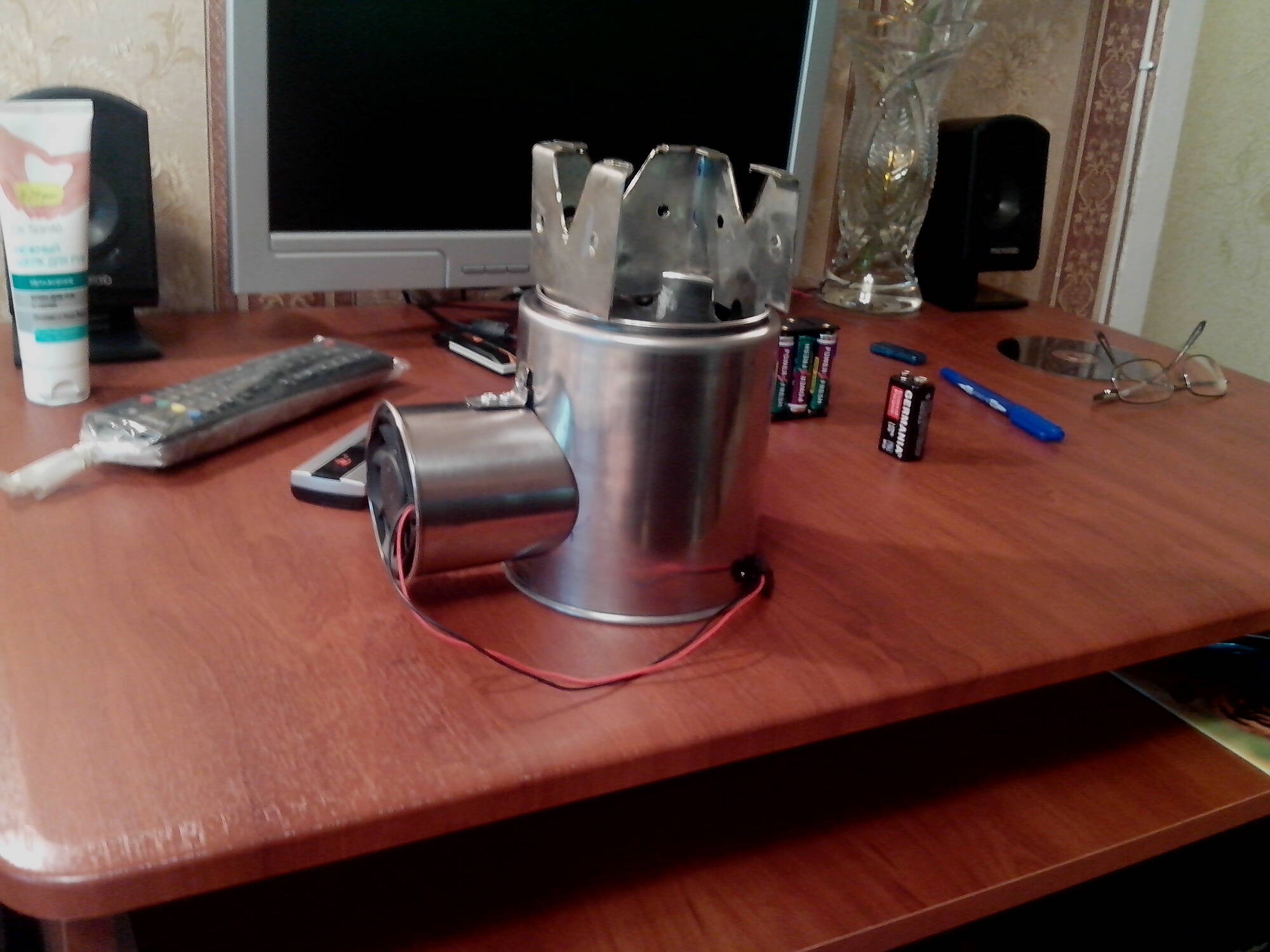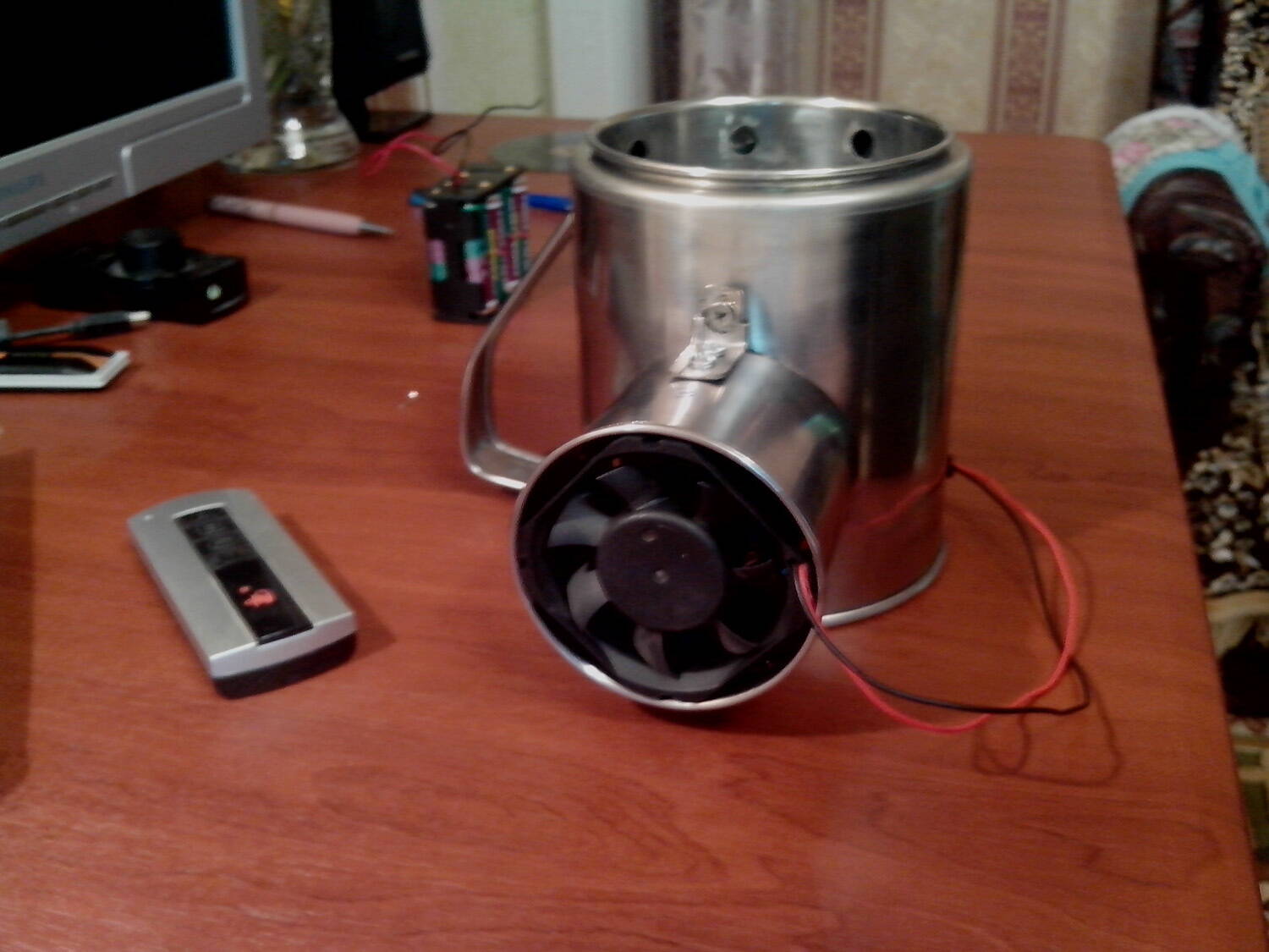Симпатично. Интересует производительность - насколько быстрее закипит к примеру полная кружка воды при дутье вентилятором и при естественном горении? Насколько быстро прогорает стенка в обоих случаях? На сколько минут дутья и с каким кулером хватает батарей ? Что с нагревом кулера? Думаю для машины очень пригодится для дополнения к газовой, а для пешки и вело - не уверен.