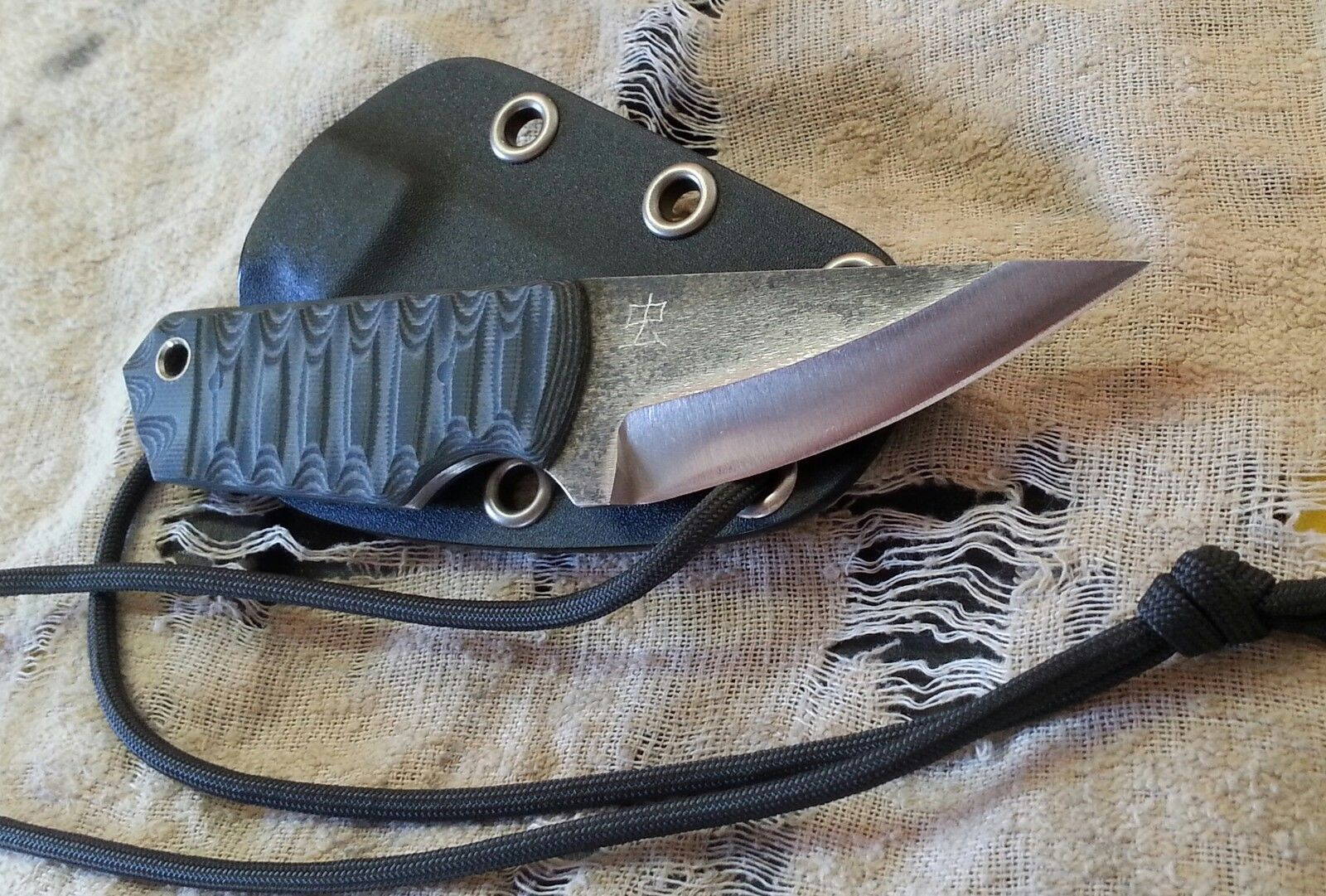 нож сделан найфмейкером(извиняюсь что коверкаю язык,просто харит думать 5минут над одним словом,уж как умею) из сан-диего сша ,самоназвание "блу васп" ,парня зовут Скат, профессионально(живет с этого) в этом деле с 2012 года,вообще занимается ножами с 90х. Сам и кует и закалку делает и д и тп. В дизайне (пока) видятся тактики(функциональные ножи с боевым оттенком) и японские мотивы.