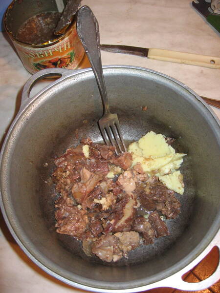А тут какой-то трудоёмкий способ приготовления фарша из сушенного мяса в поход: