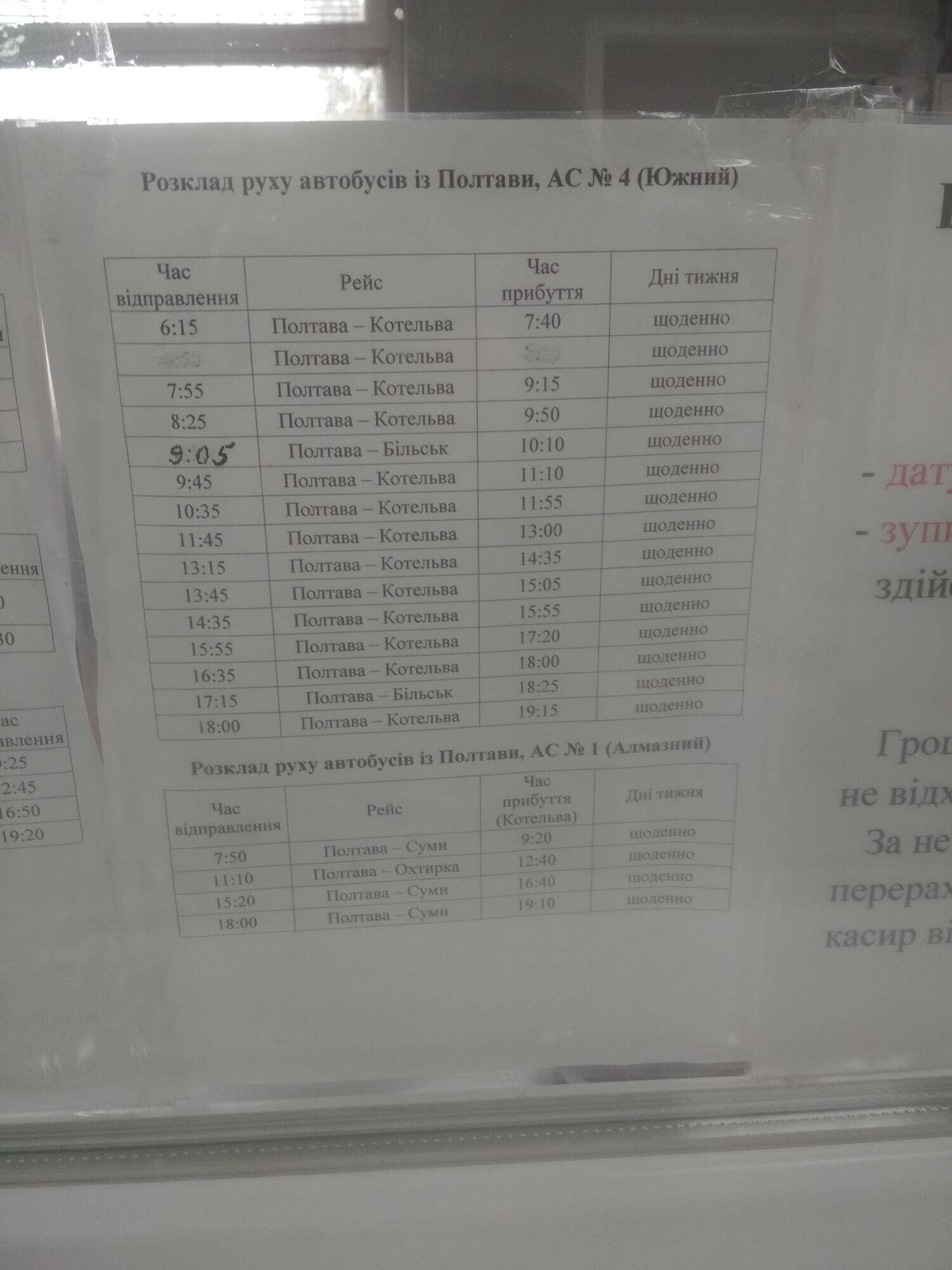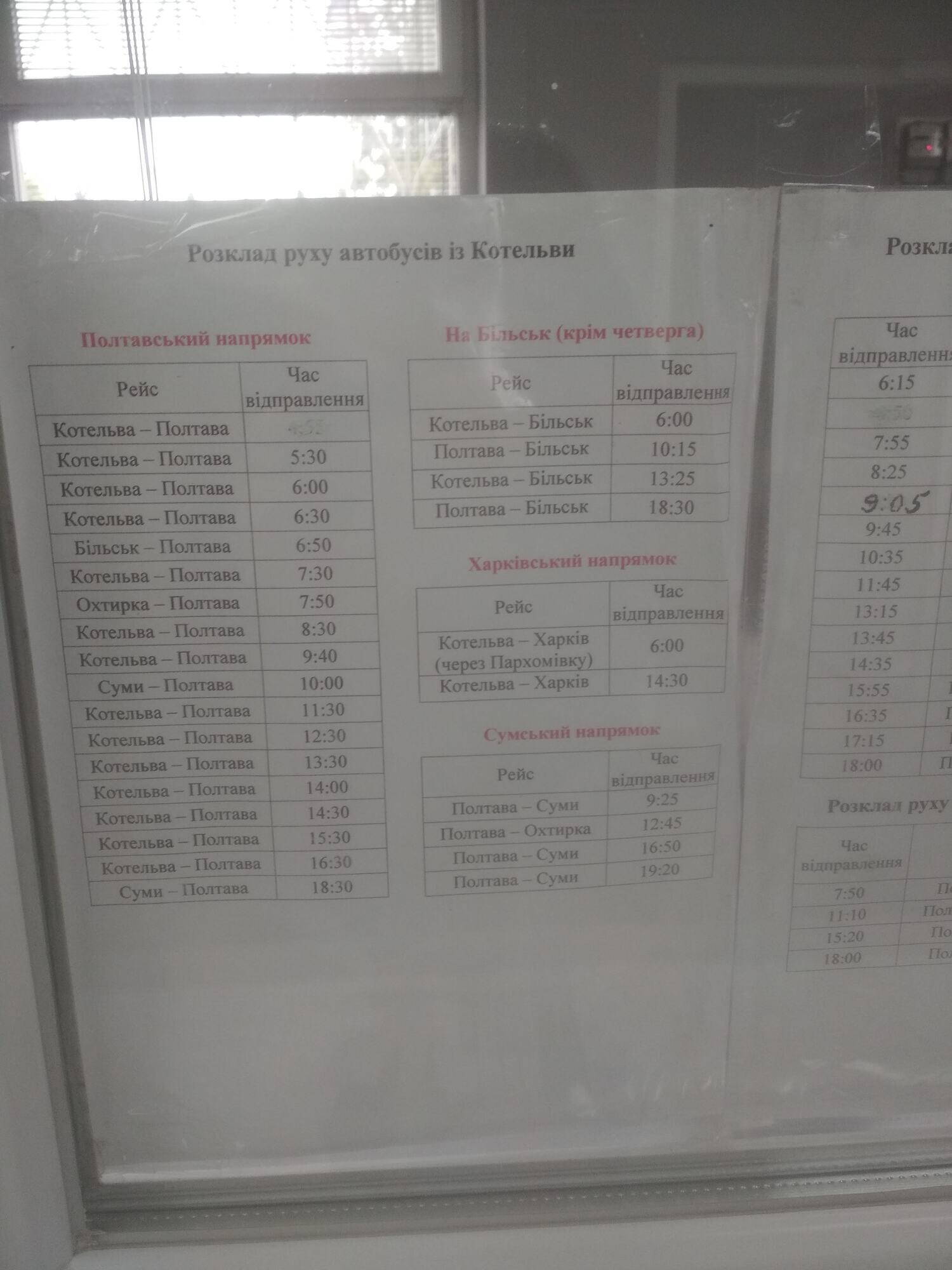 Сплавлялись на прошлых выходных Климентово-Котельва. Прилагаю расписание автостанции Котельва. С инетом не сходится, на вокзале в Полтаве то же не точно по телефону говорят. На этом пути 1 плотина, без всяких тросов и плакатов предупреждений, если прощелкал - ты труп. Еще на пути два реальных завала в козятине и буймеровке. мы обносили. В козятине есть труба с водой, координат нет,там на опушке дач в лесу торчит труба с хорошим дебетом