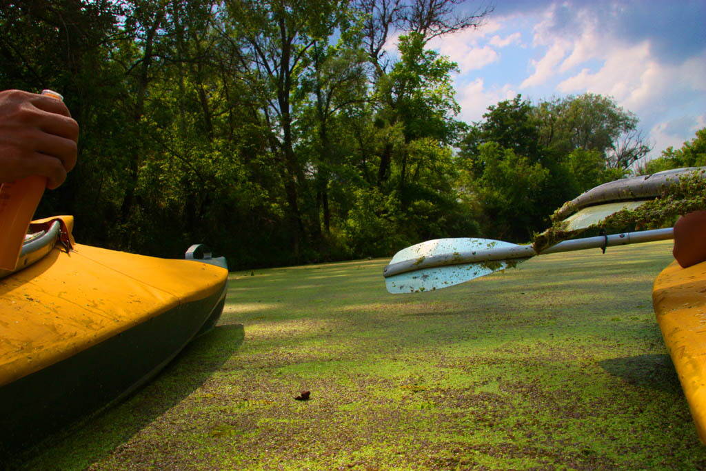 Короче, не удержались мы и вошли в старое русло с Оскола. Первые метров 800 вообще никаких вопросов.... дикие и красивые места, потом упавшее дерево, которе перекрывает русло почти полностью...ну а затем самое интересное - мели, камыши под 2 метра, вобщем настоящий экстрим. С байдарок не вставали, местами сушили весла и "гребли" хватаясь за камыши и таким образом толкали байдарки.... короче выбрались. Рыбак который стоял на лодочке прямо возле выхода на Донец подАхренел увидев выбирающиеся из кустов байды :D .