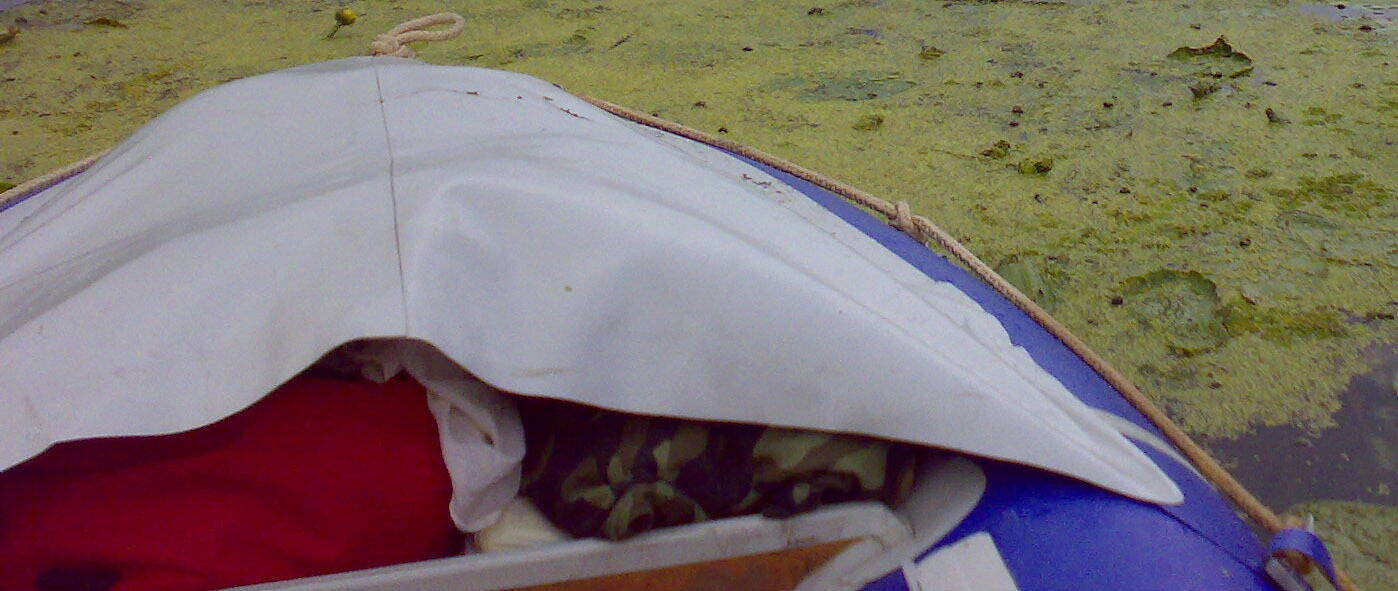 Примерно через километр уткнулся в завал из водорослей, мусора, камыша, ряски и каких-то веток. Между завалом и камышом проход шириной около метра, накрытый толстой подушкой водорослей и ряски. Встал в полный рост в лодке и подтягивался с одной стороны за растущий камыш, сдругой стороны за растения на завале. В проходе похоже плавало очередное бревно, потому что явно на что-то всползал. После этого шел извилистым руслом переменной ширины с часто встречающимися упавшими деревьями через всю реку, но везде кем-то выпилены проходы, иногда узкие и извилистые, но проходимые. Пару раз на большой скорости утыкался бортом лодки на торчащие обломки веток, царапин и повреждений на лодке не появилось. На ночевку стал после слияния двух проток в одну реку примерно в 20.30. Обнаружил