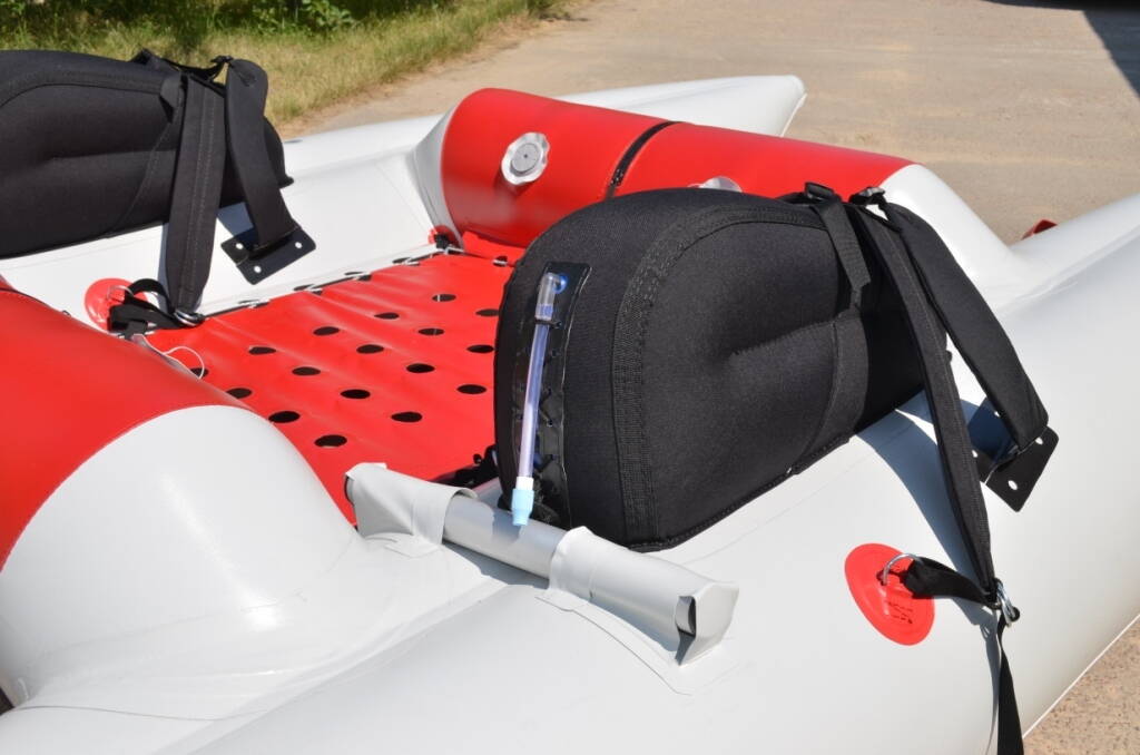 Катамаран плоскобаллонный, высока посадки около 30 см, поэтому сидишь достаточно близко к воде. Коленные ремни подсмотрели у других фирм производителей. В конструкции без рамы без них действительно не очень удобно, но возможно их не помешало бы ставить на любой катамаран.