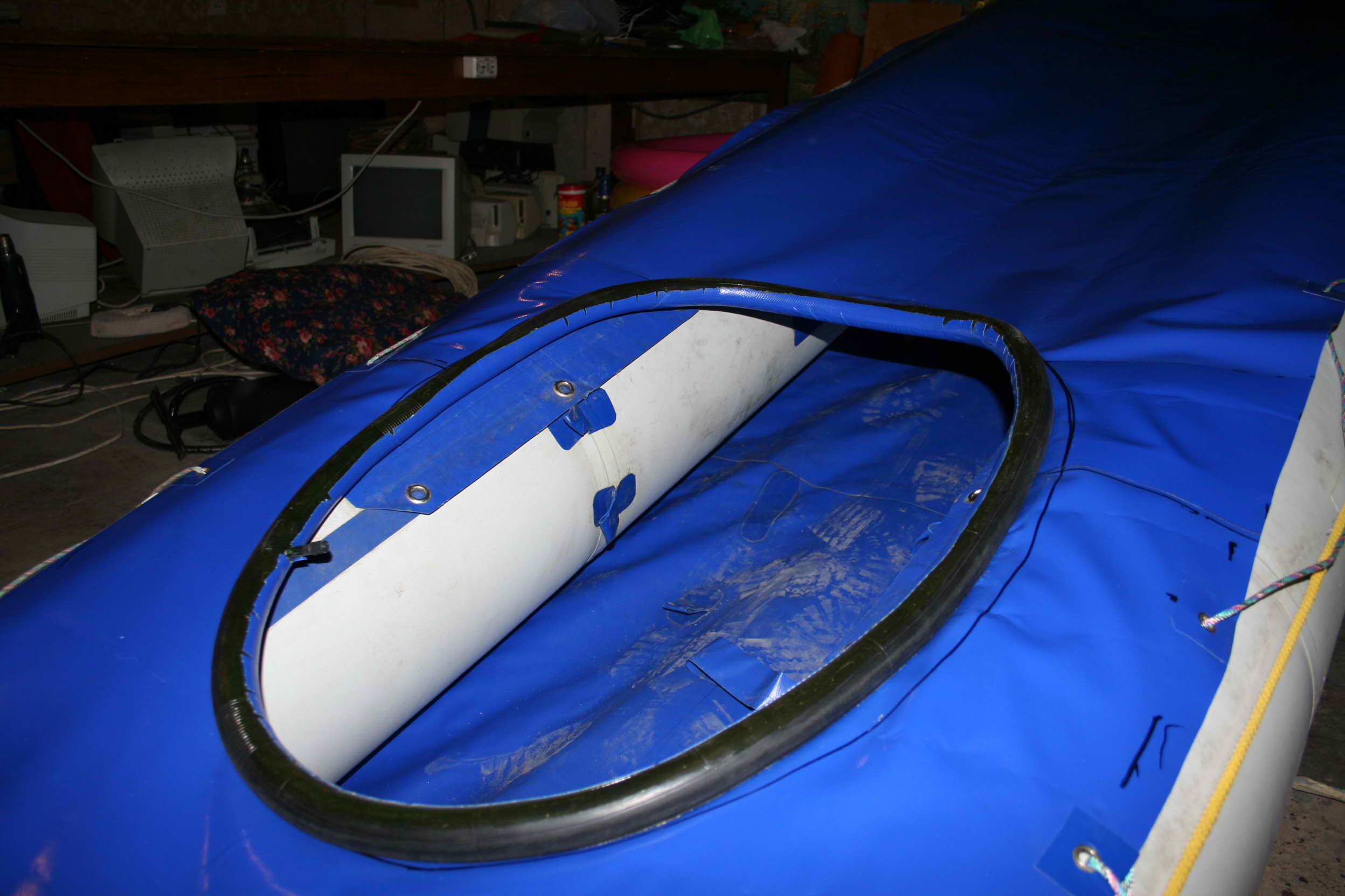 Вот завершены работы по подготовке трёхместной байдарки производства "Главного Романтика" для сплава по бурной воде. Выношу на суд общественности.Добавлено:фартук , надувное дно, упоры для спины и ног. Удалены фанерные слани, сидушки и надувной киль. В процессе работ использовались следующие материаллы:ткань ПВХ 800г/м2- около 4 м, камеры велосипедные 28"-2шт., китайский надувной бассейн -1 шт.,липучка(застёжка) - 1,3 м ,люверсы ,клей. Все изменения обратимы, ибо для спокойной воды киль буду возвращать на место.