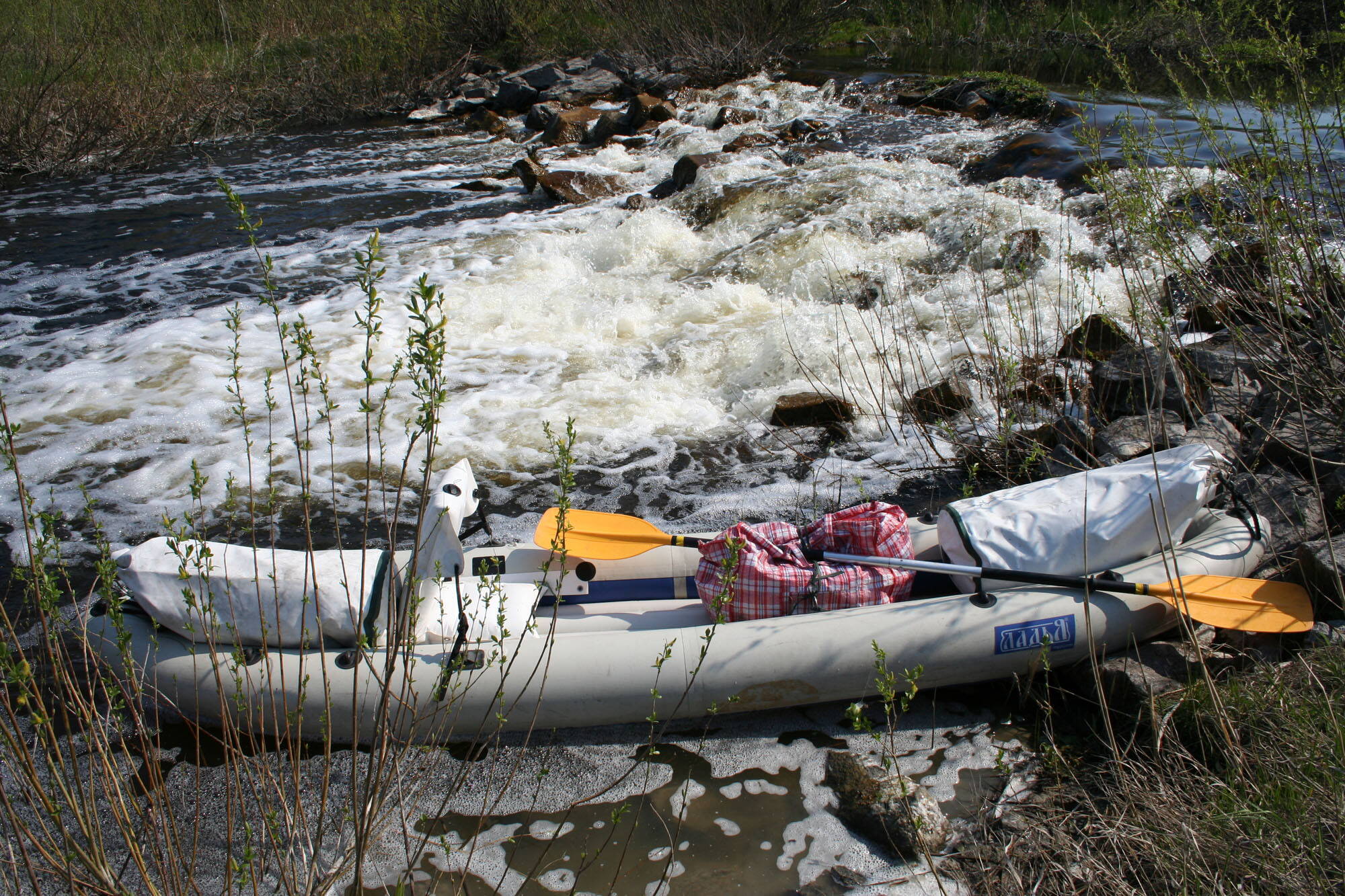 В этом коротком походе получился уникальный состав байдарок в нашей группе из 7 человек. Это были такие байдарки: «Таймень» двойка (чистый каркасник), «Гарпун» двойка (каркасно-надувная байдарка) и «Игла» двойка (чистый надувастик) и я на Ладье-единичке (чистый надувастик). Чтобы не утомлять читателя сразу скажу – Ладья показала себя превосходно! Даже по сравнению с двойками моя единичка отставала только на ровном и совсем не на много! На быстрине, в завалах я вообще вырывался в лидеры без особого напряга! Лодка без деки и с такой серьезной остойчивостью позволяет скакать по судну как угодно (привставать, вставать, пересаживаться, ложиться при прохождении «расчесок» и под мостами-переправами и так далее). Курсоустойчивость у 380й Ладьи отличная. Это все в совокупности делает Ладью более безопасной по сравнению с лодками с декой (типа Тайменя и Гарпуна). А вот, по сравнению с аналогичной Иглой, Ладья обладает отличной остойчивостью и грузоподъемностью.