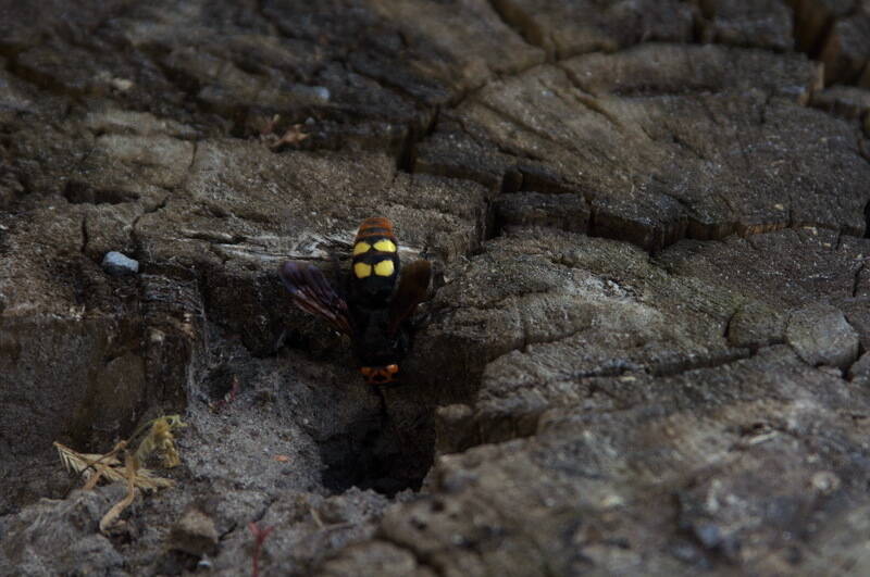 Группа из 5-7 этих насекомых я несколько дней подряд наблюдал кружащими в одном и том же месте у самой земли. Сначала думал что там их нора или лежит сбитое гнездо, но ничего такого не нашёл.