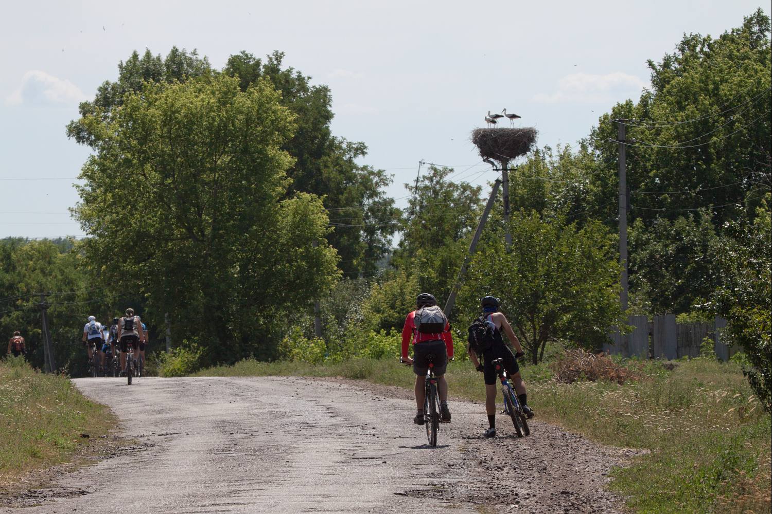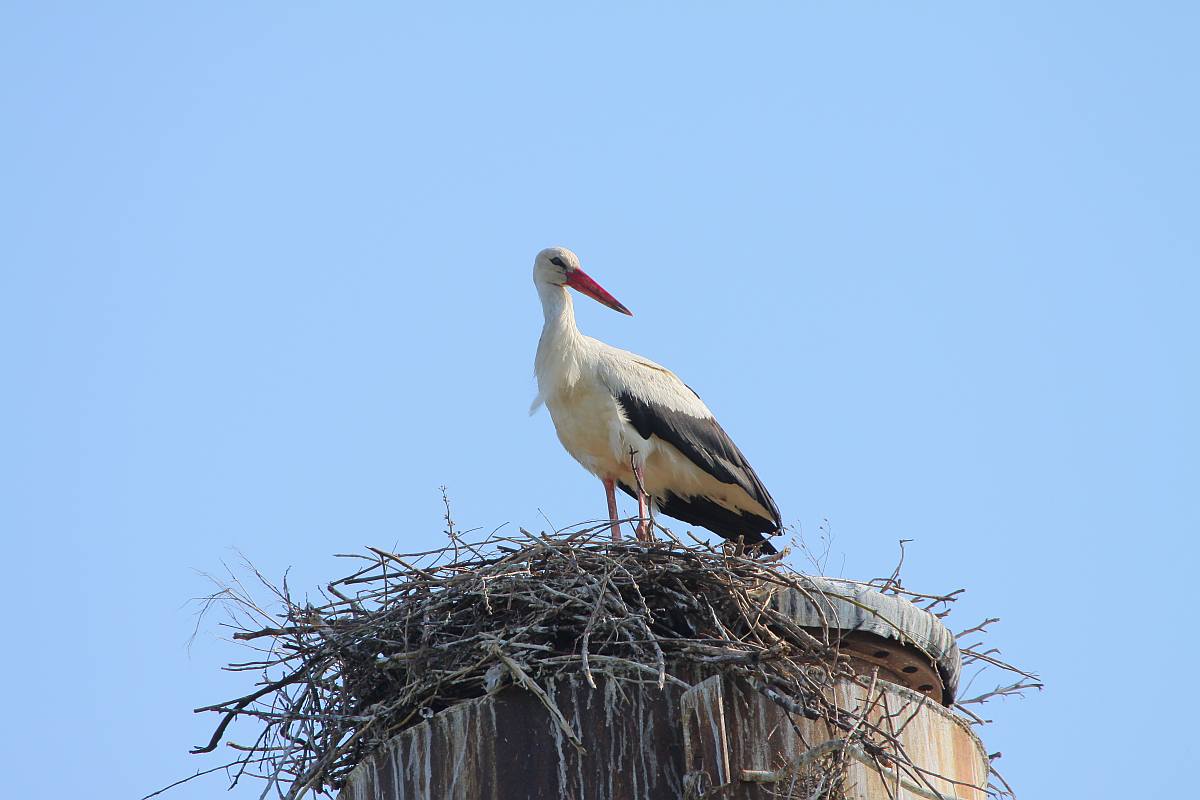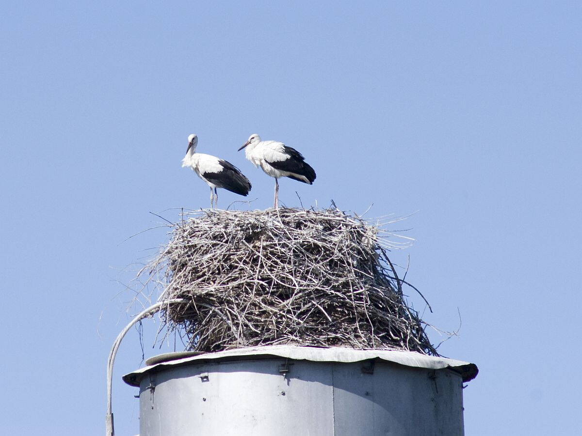 Огромное старое гнездо, которое на фото, располагалось на старой водонапорной башне, которую пару лет назад спилили на металлолом. На месте башни установили столб с крестовиной наверху, но он пустовал до этого года. В этом году аисты поселились на этом месте снова.