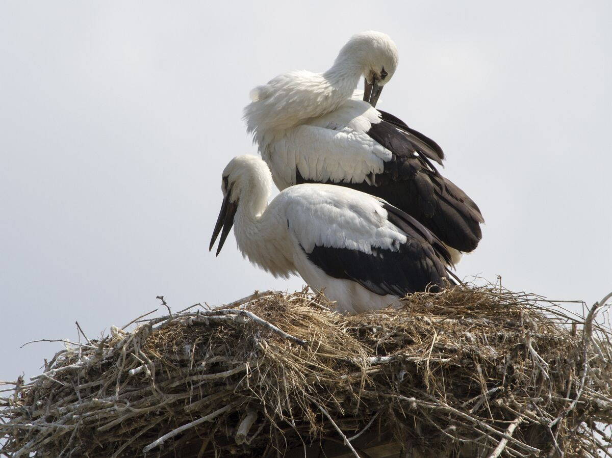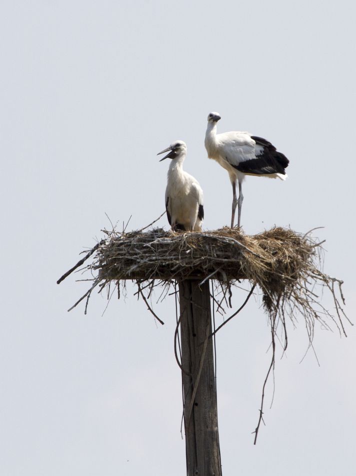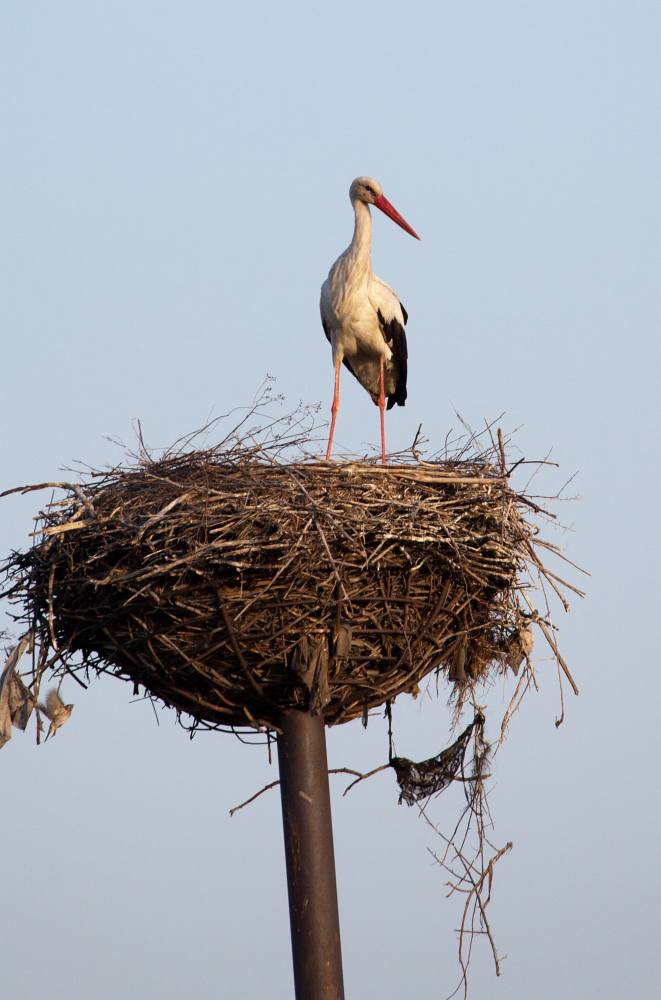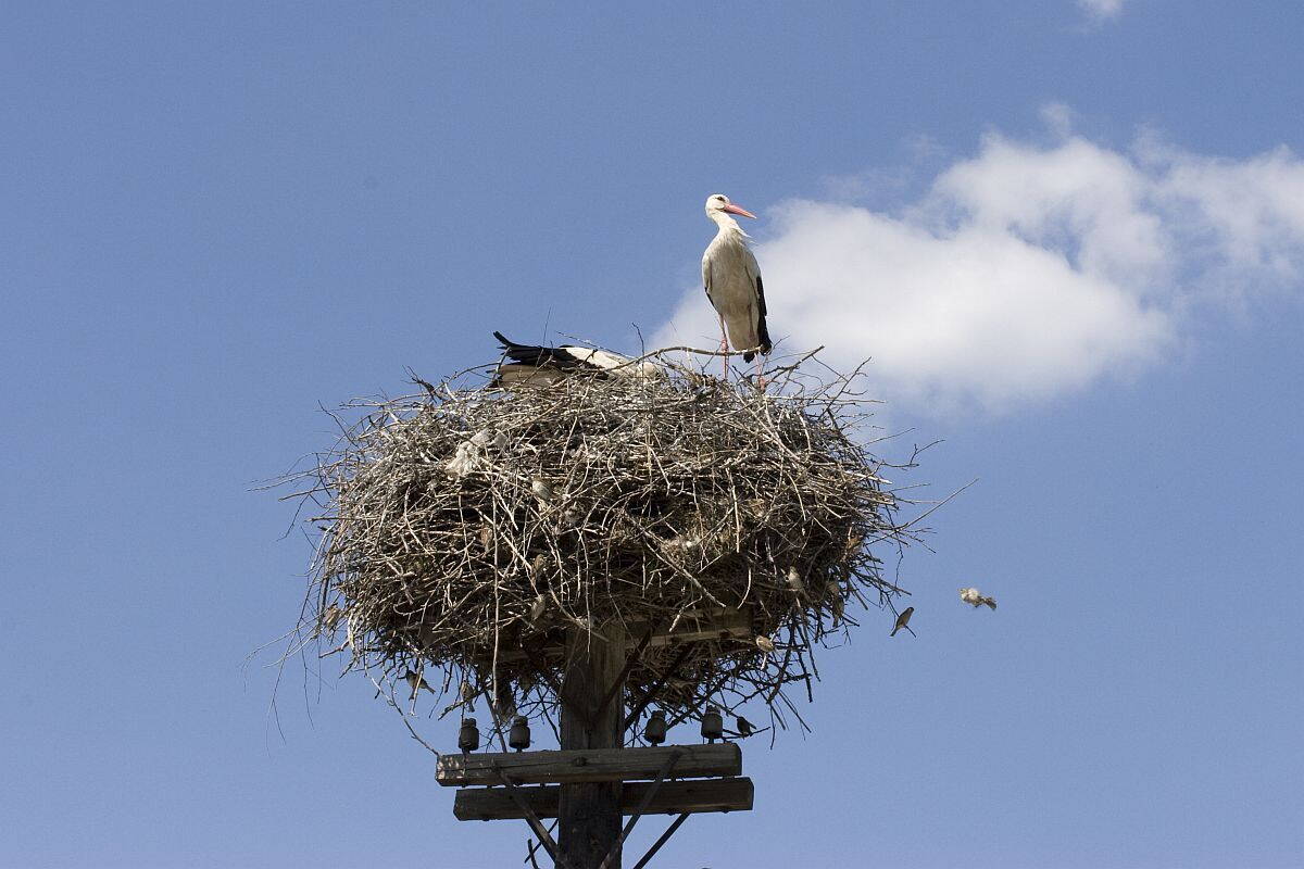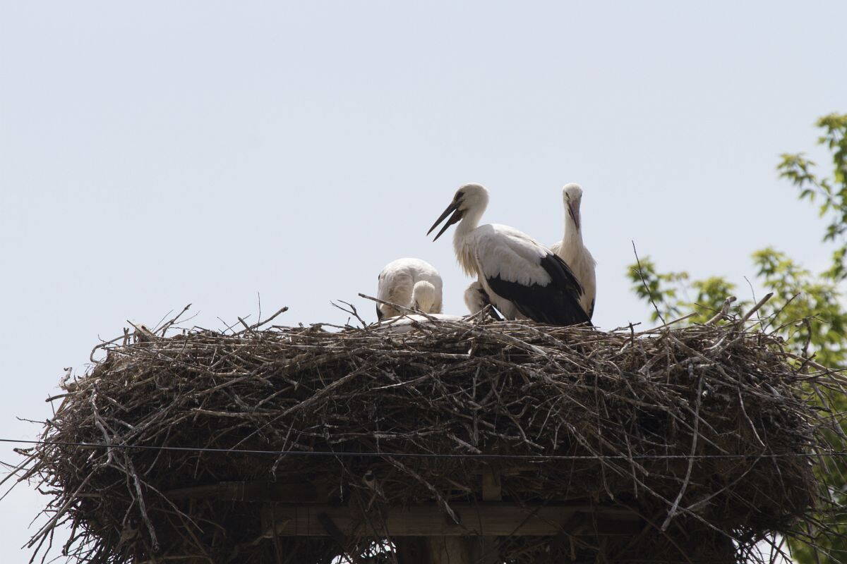 Гнездо устроено на специально оставленном старом телеграфном столбе; кроме аистов в нем гнездятся как минимум десяток воробьиных семейств.