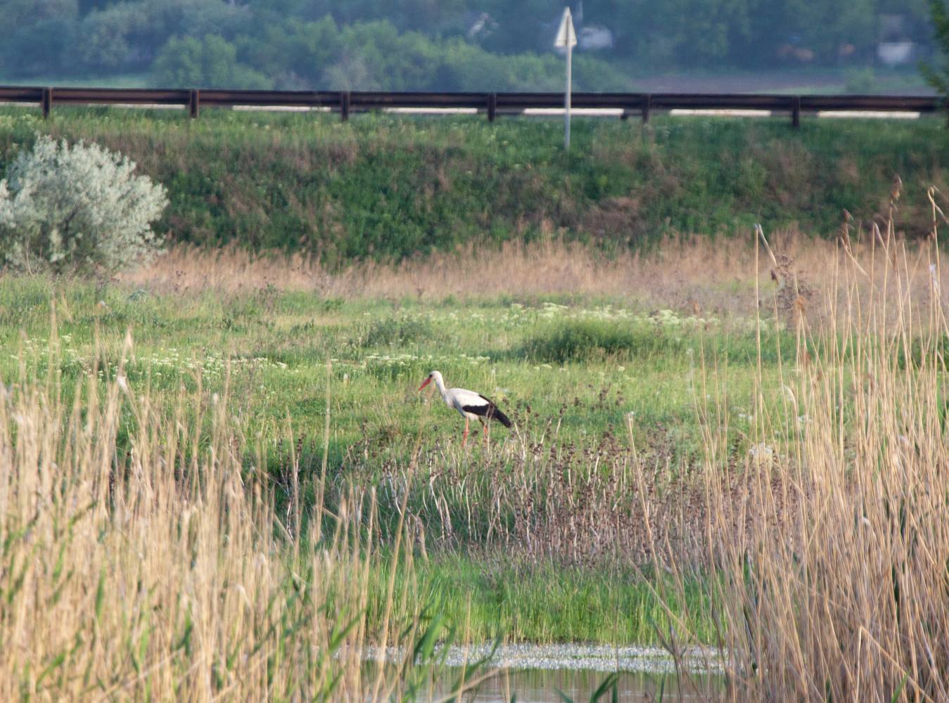 Видимо, раньше здесь было какое-то другое строение - сарай, хата, водонапорная башня, может, дерево с аистиным гнездом, которое снесли при строительстве автотрассы, а аисту предложили вот такую стальную "замену" - и аист воспользовался ею, несмотря на шумное соседство республиканской автострады. Вечером чета аистов прогуливалась по лугу около речки Самары, а утром одного из них наблюдал на гнезде.