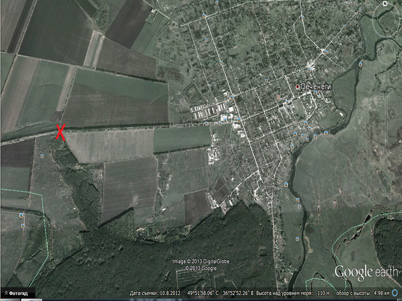 Место обозначено крестом, рядом крутой спуск (если ехать со стороны Кочетка на Печенеги)