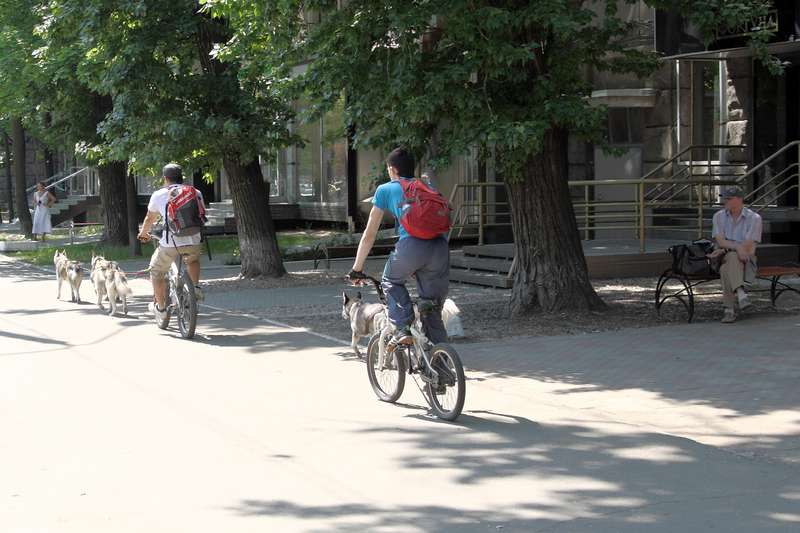 Собачьи упряжки ехали слишком быстро и в неожиданном месте, хороших картинок не получилось. Предложение хозяевам: совершенно бесплатно отснимем ваших питомцев в более удобных условиях, желательно тоже вместе с велосипедом.